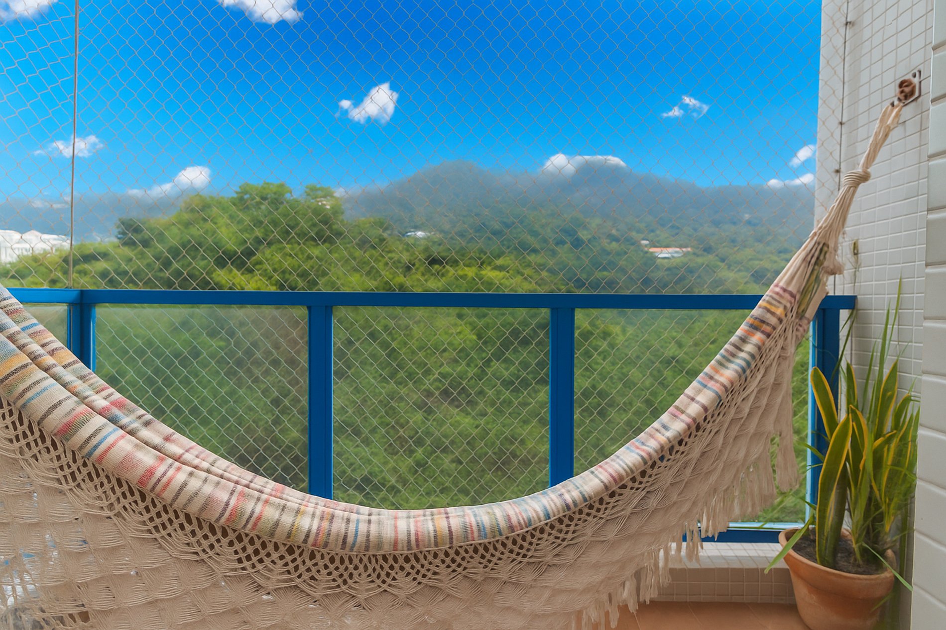 Dispõe de 1 quarto com cama de casal, 1 banheiro completo com ducha quente, sofá-cama de casal na sala, ar-condicionado nos dois ambientes, Wi-Fi, cozinha completa, lavanderia com lava e seca, sala de jantar e varanda com rede e vista para a Floresta da Tijuca.