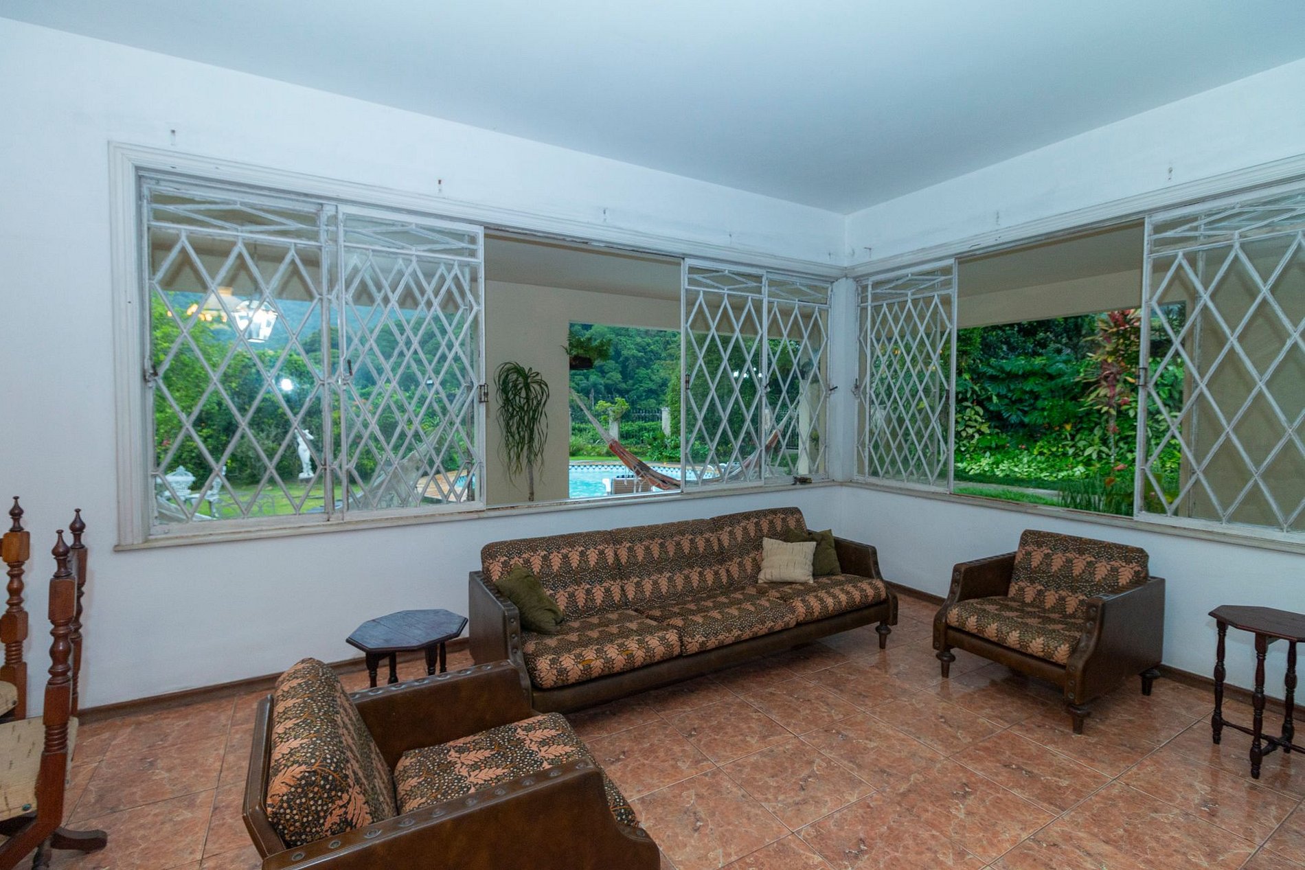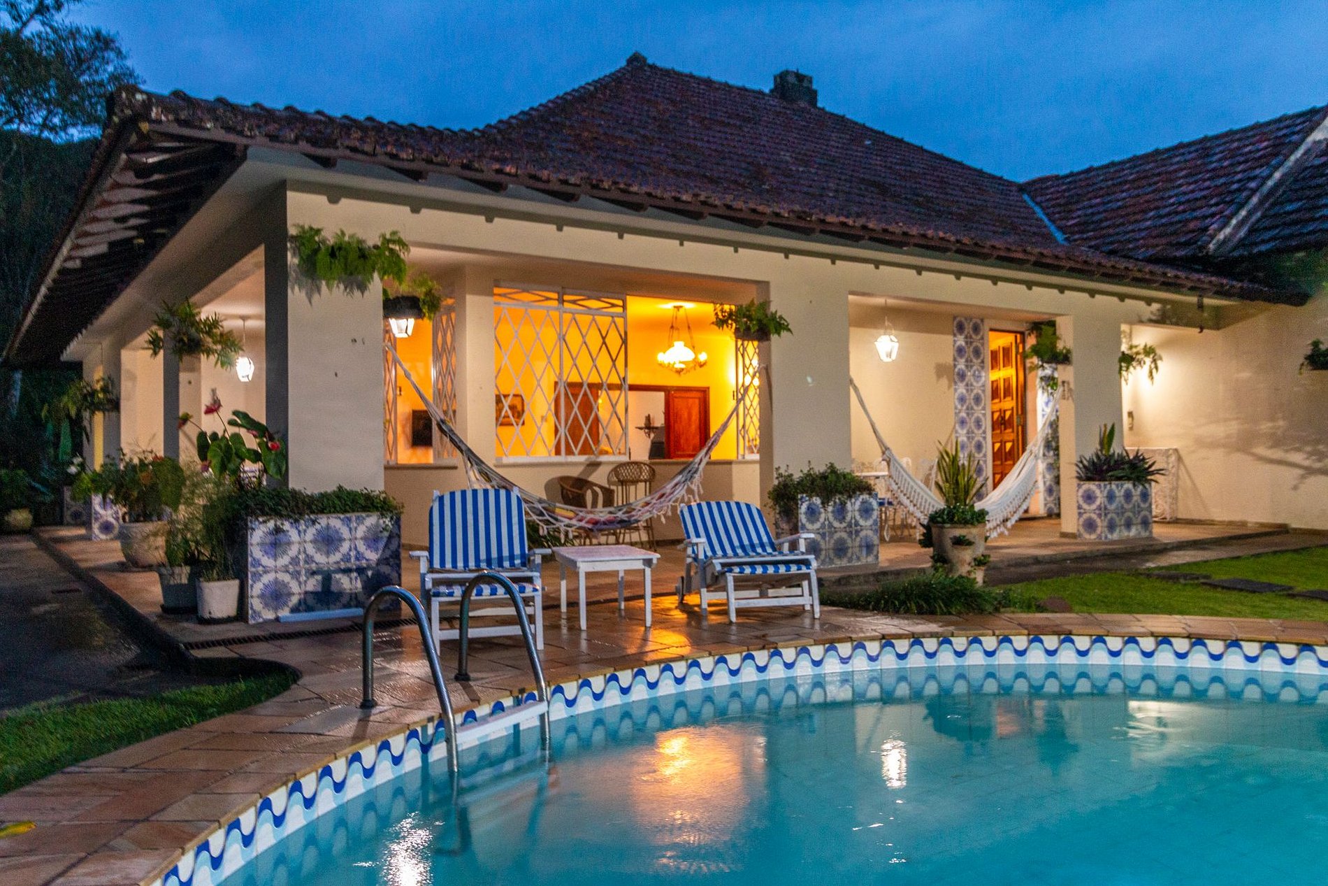 A área externa é um dos grandes encantos: jardim amplo, piscina com vista para a montanha e uma varanda com redes que é um convite ao descanso. A churrasqueira coberta completa o espaço e torna tudo ainda melhor para reunir família e amigos.