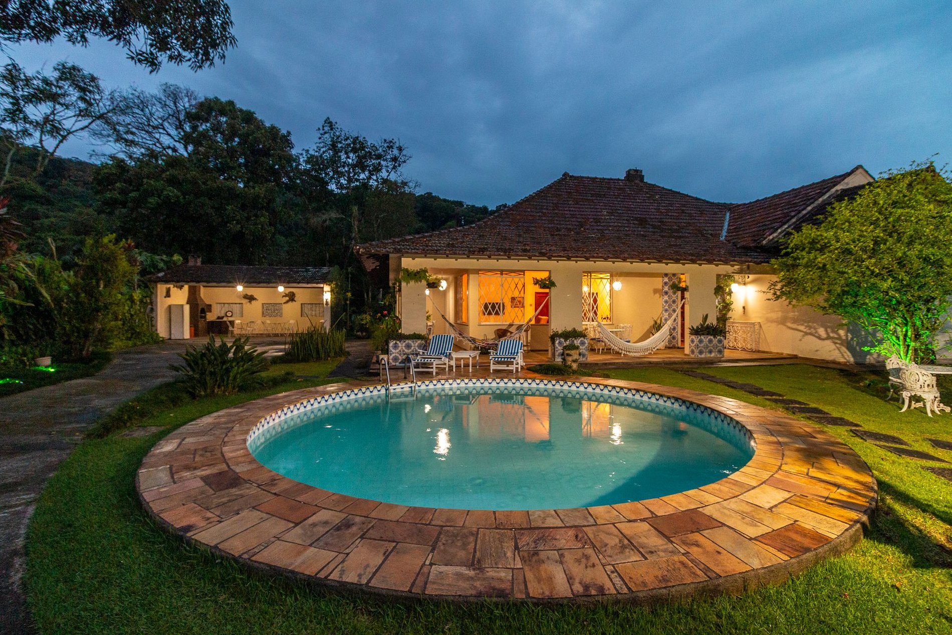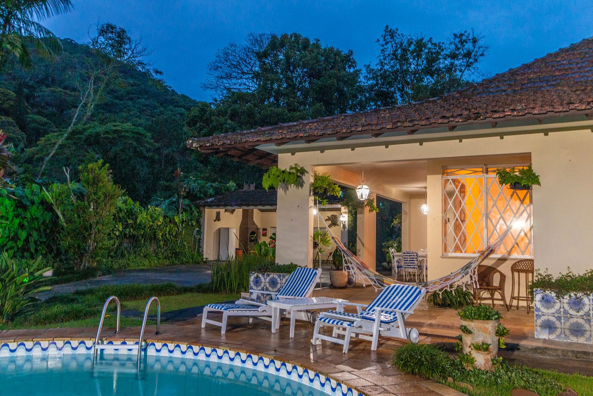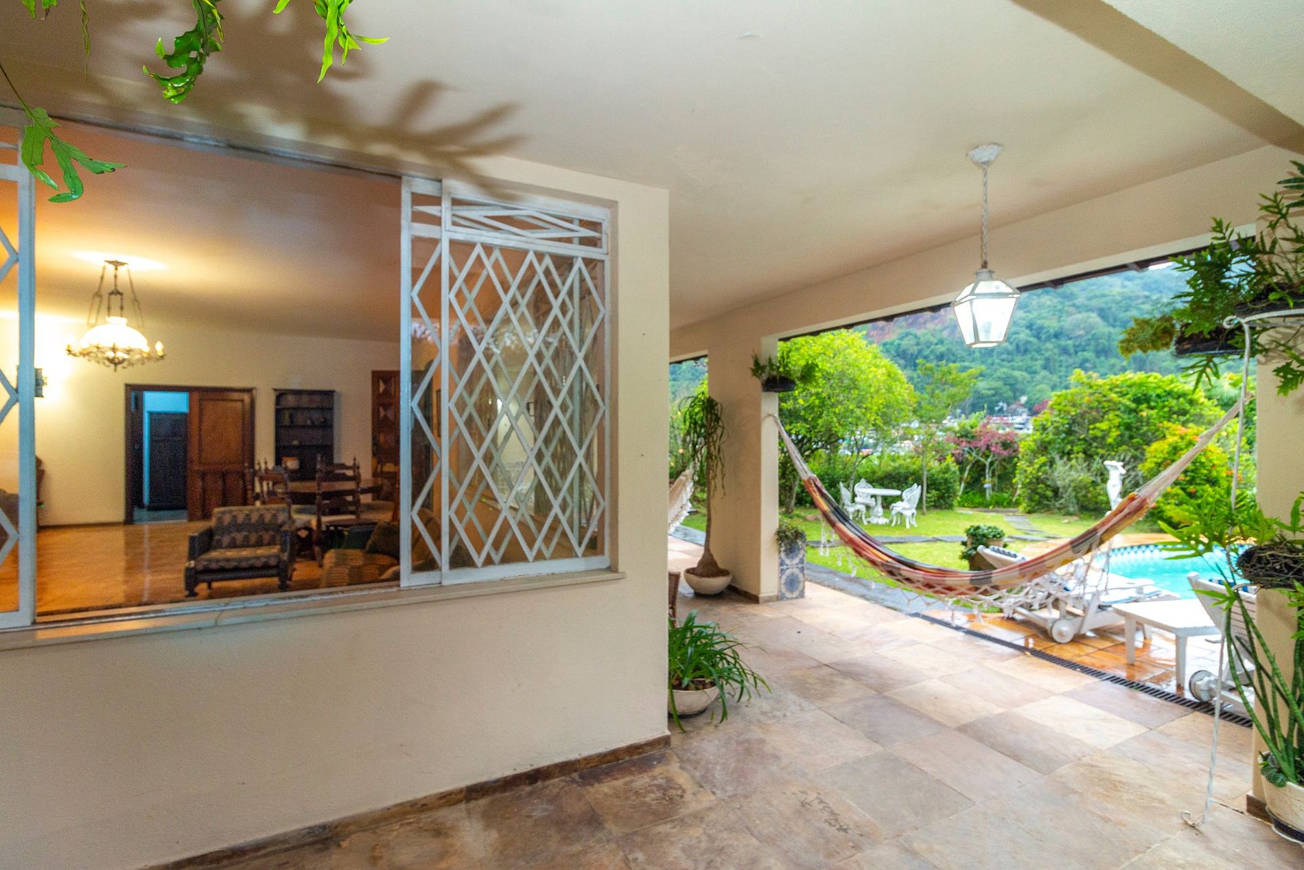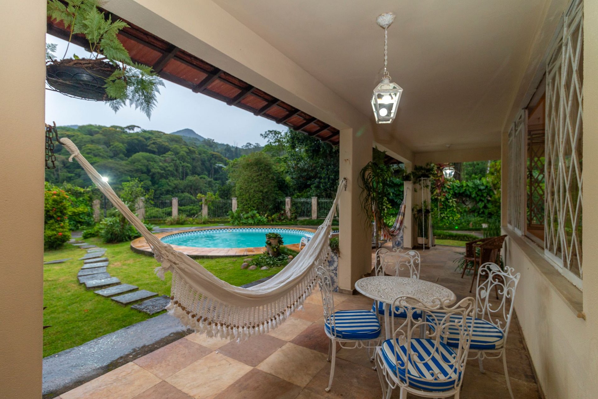 A área externa é um dos grandes encantos: jardim amplo, piscina com vista para a montanha e uma varanda com redes que é um convite ao descanso. A churrasqueira coberta completa o espaço e torna tudo ainda melhor para reunir família e amigos.