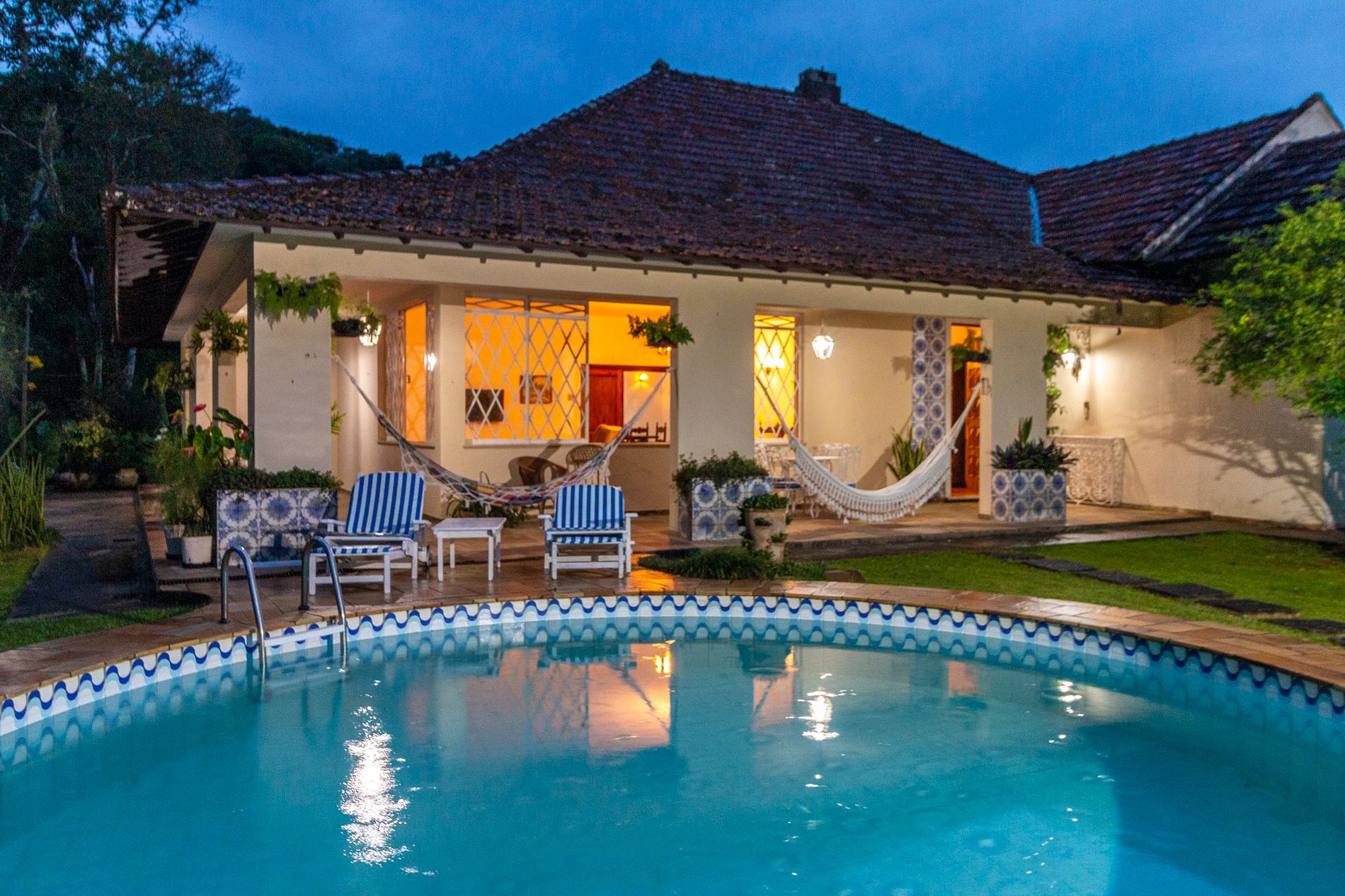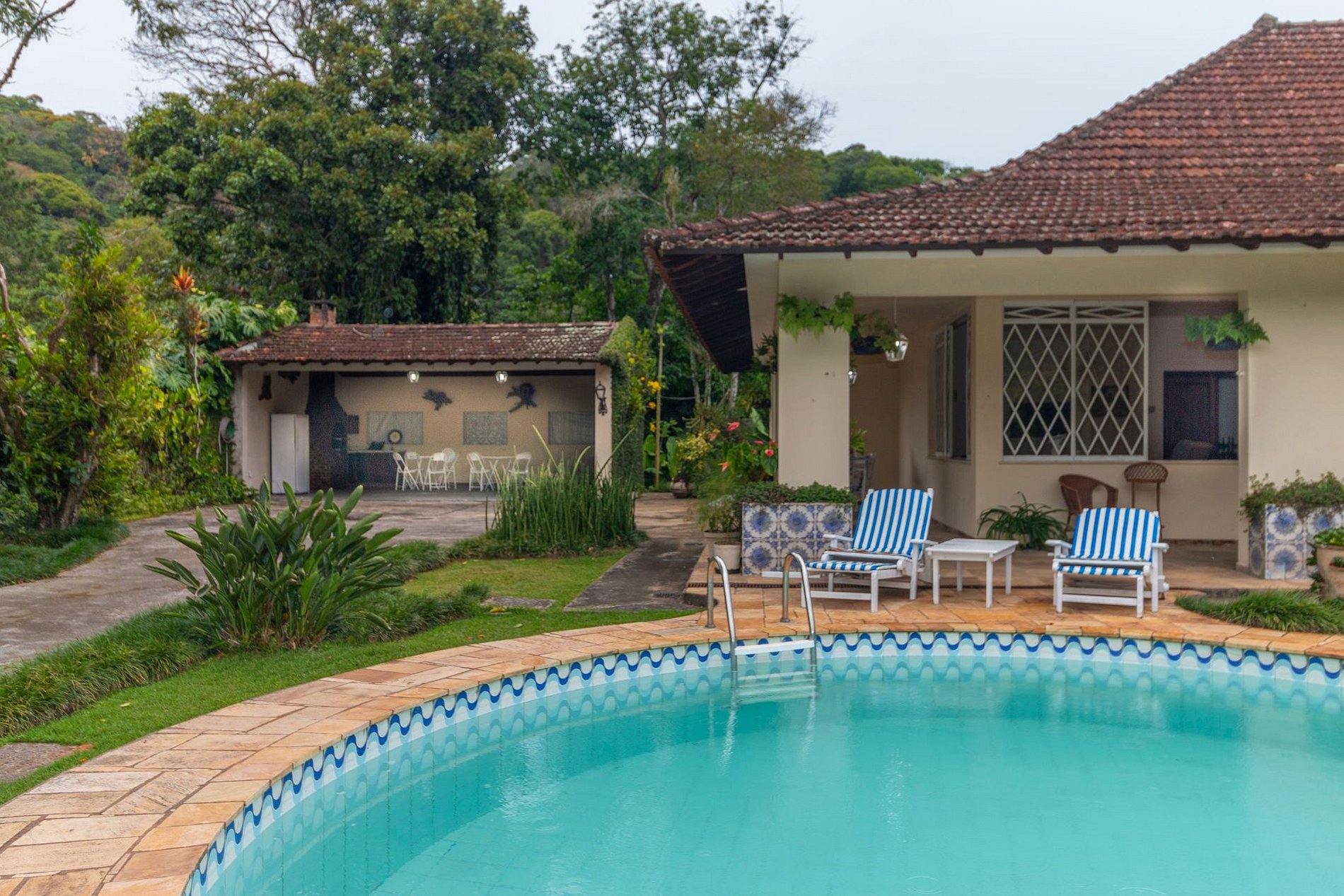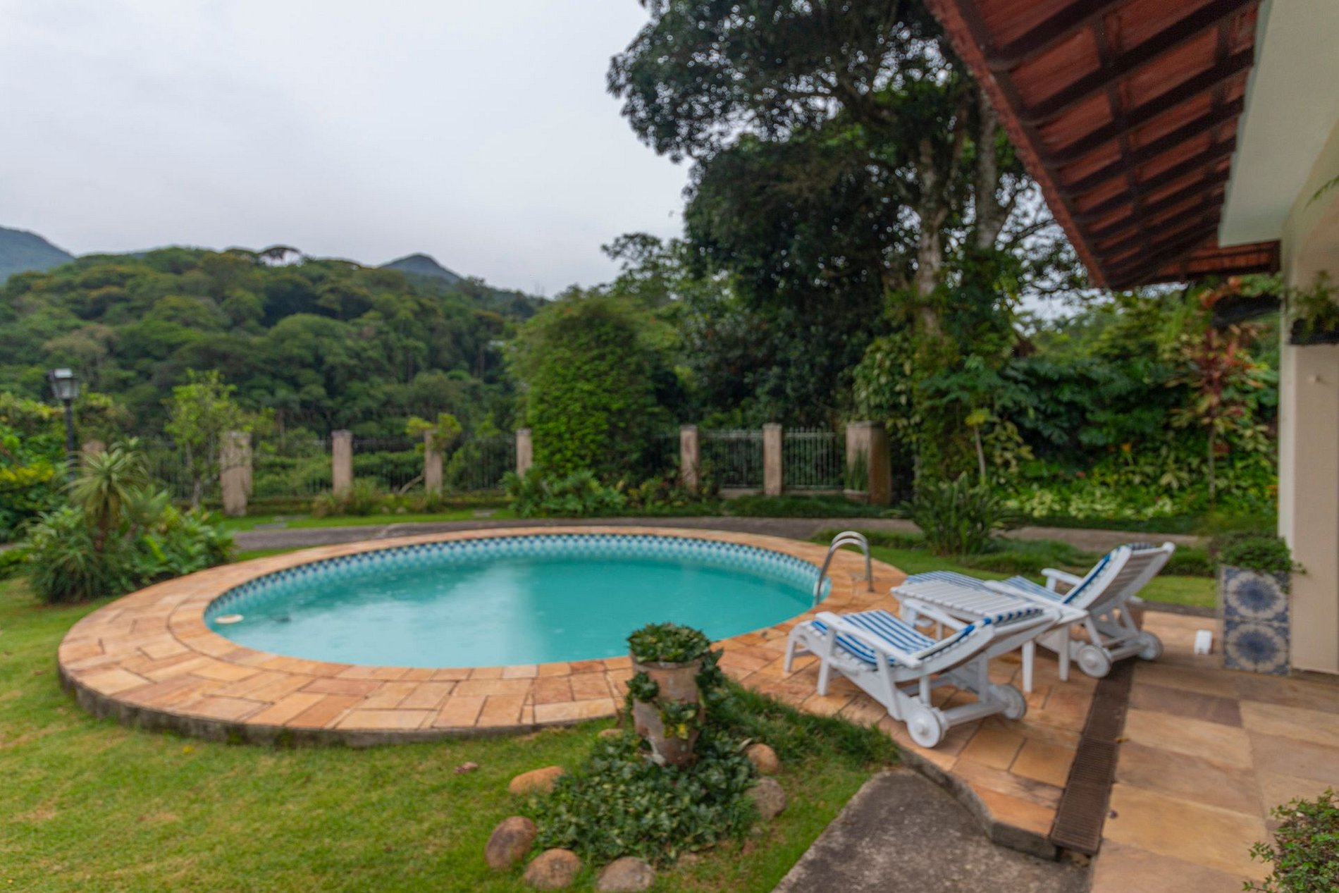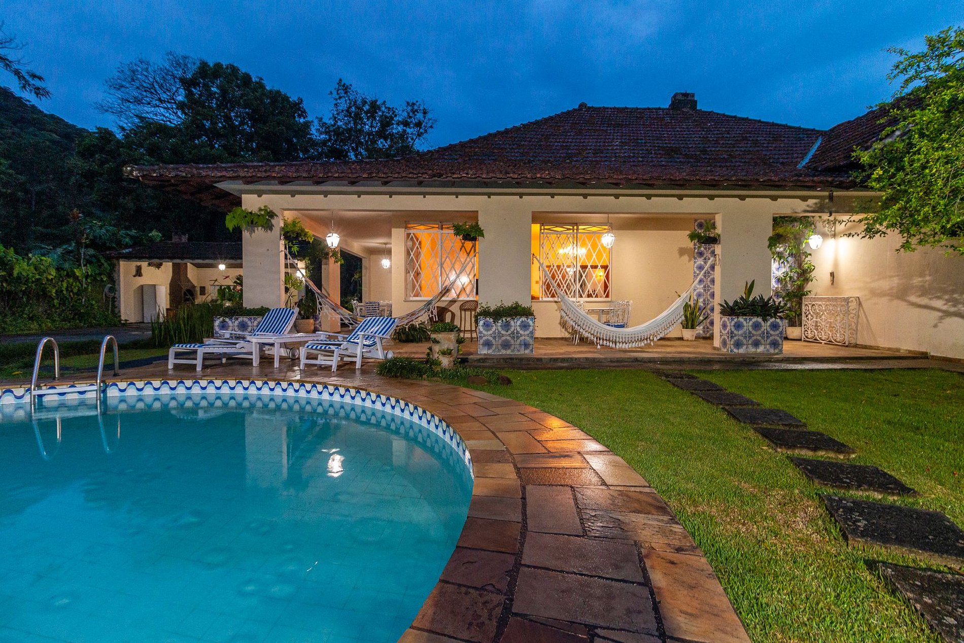 A área externa é um dos grandes encantos: jardim amplo, piscina com vista para a montanha e uma varanda com redes que é um convite ao descanso. A churrasqueira coberta completa o espaço e torna tudo ainda melhor para reunir família e amigos.