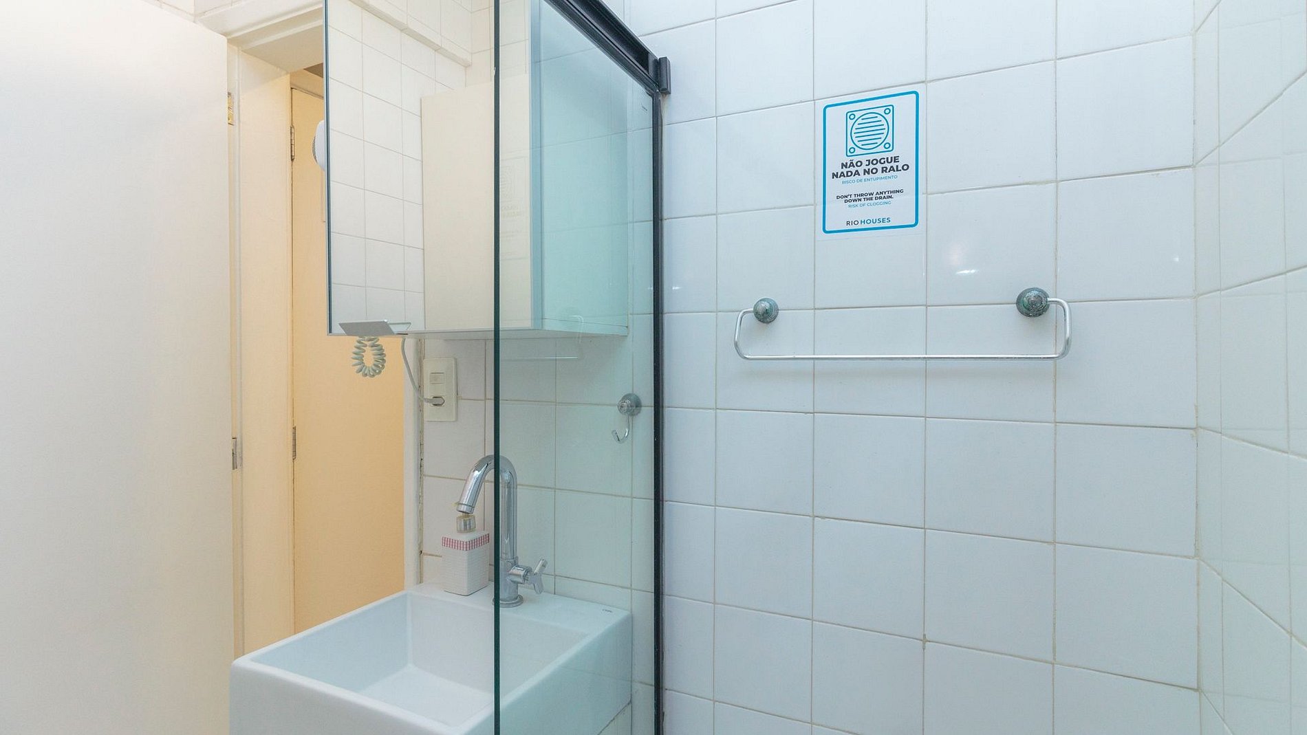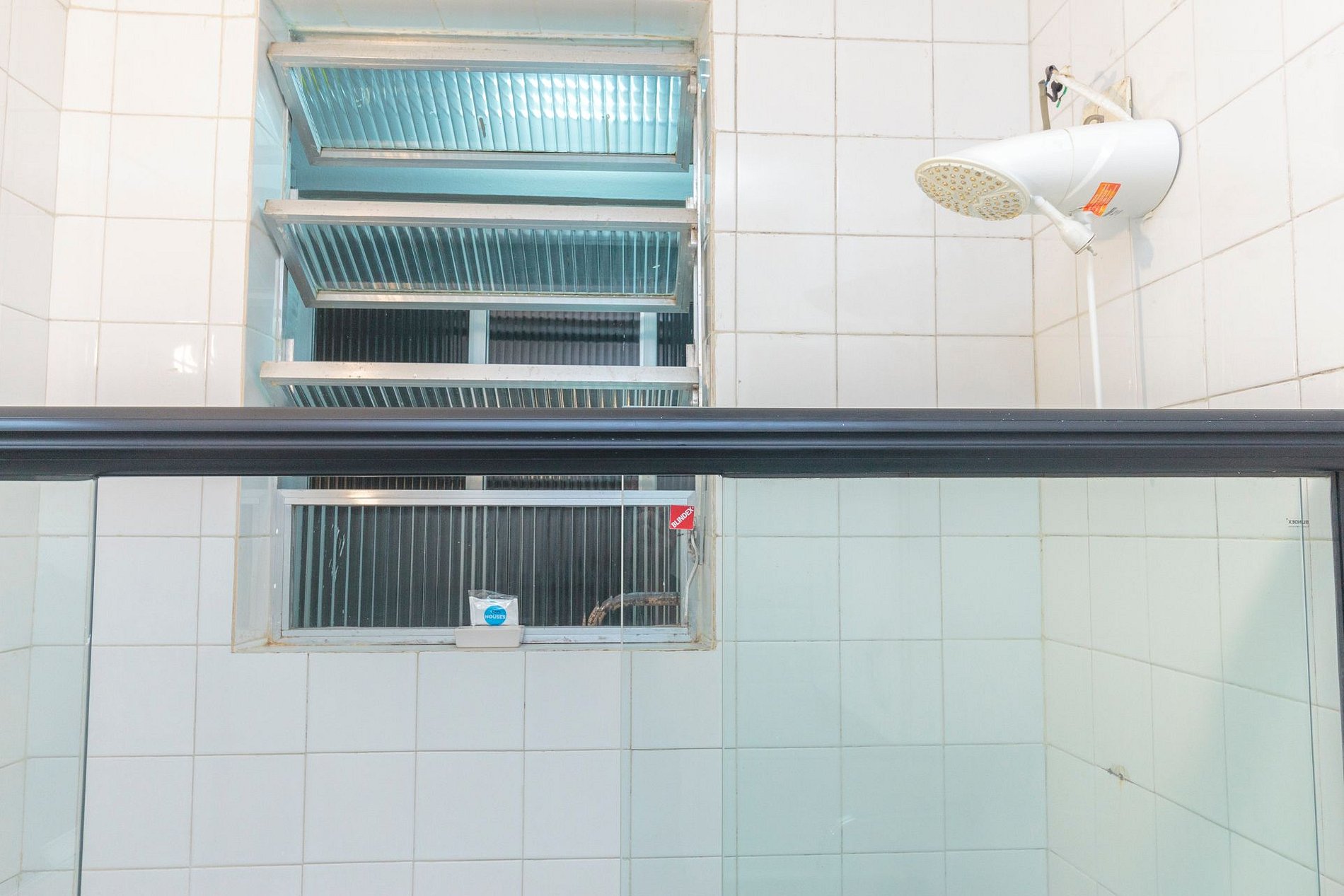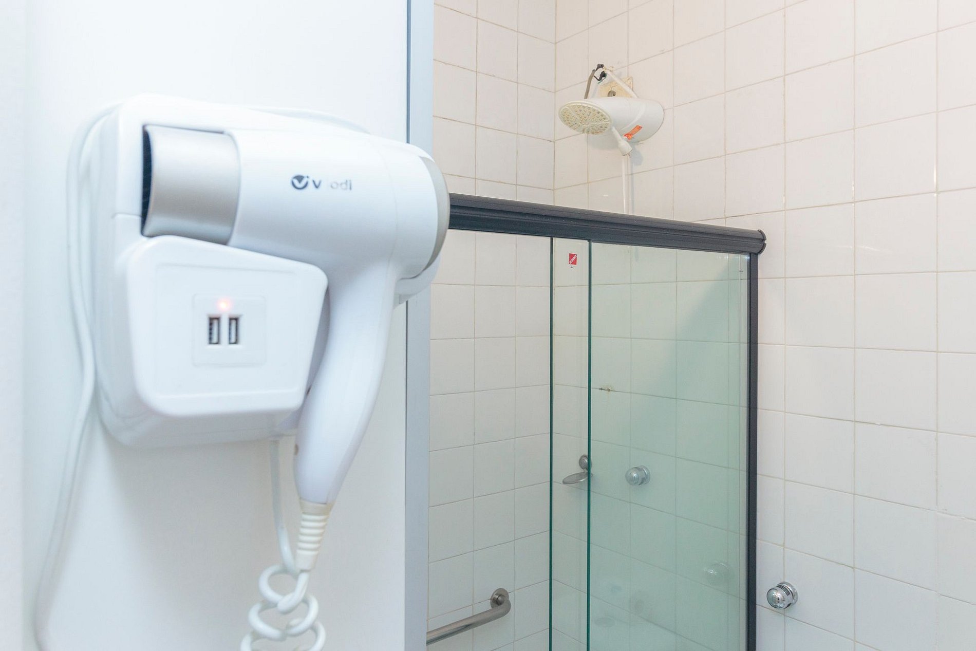 O banheiro conta com chuveiro elétrico e secador de cabelo.