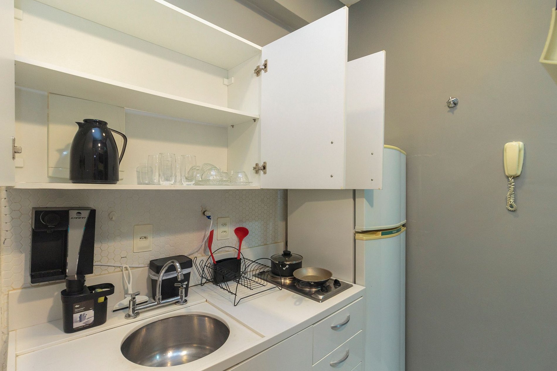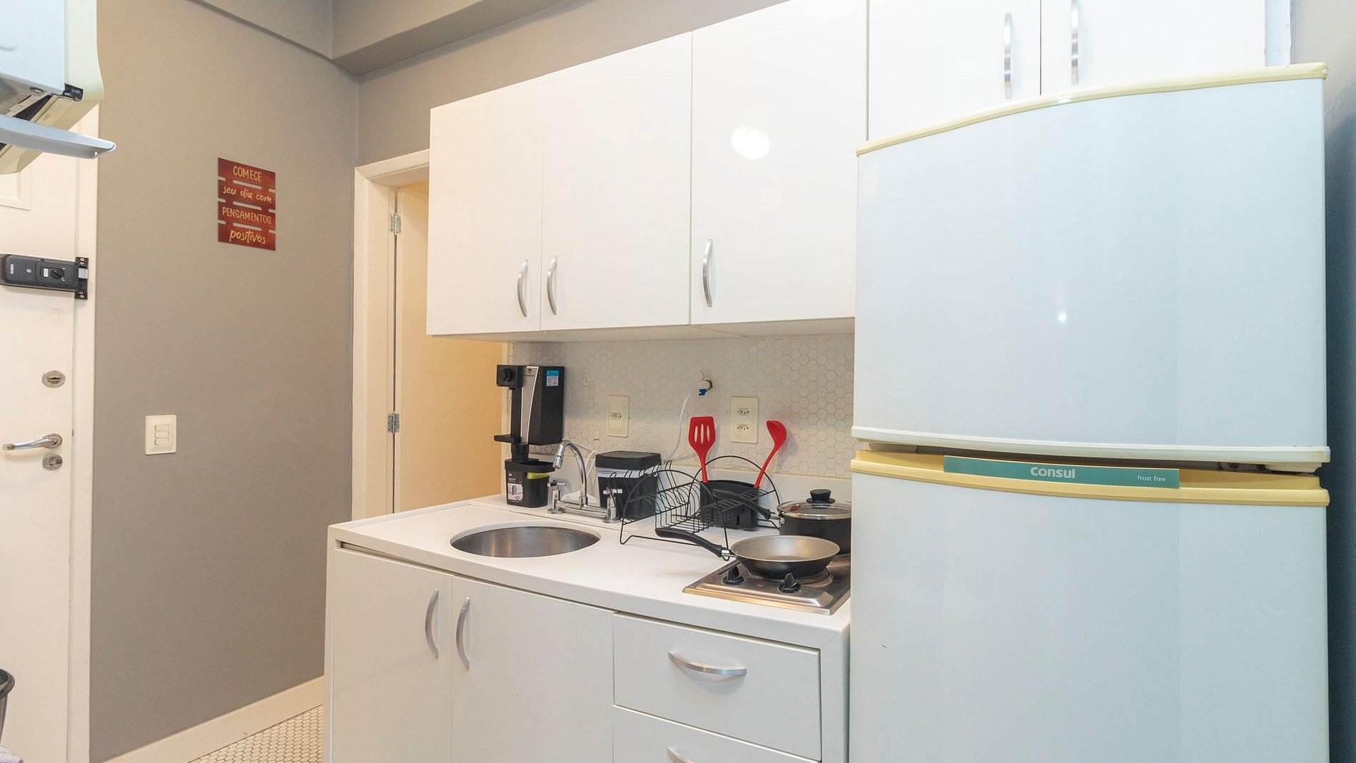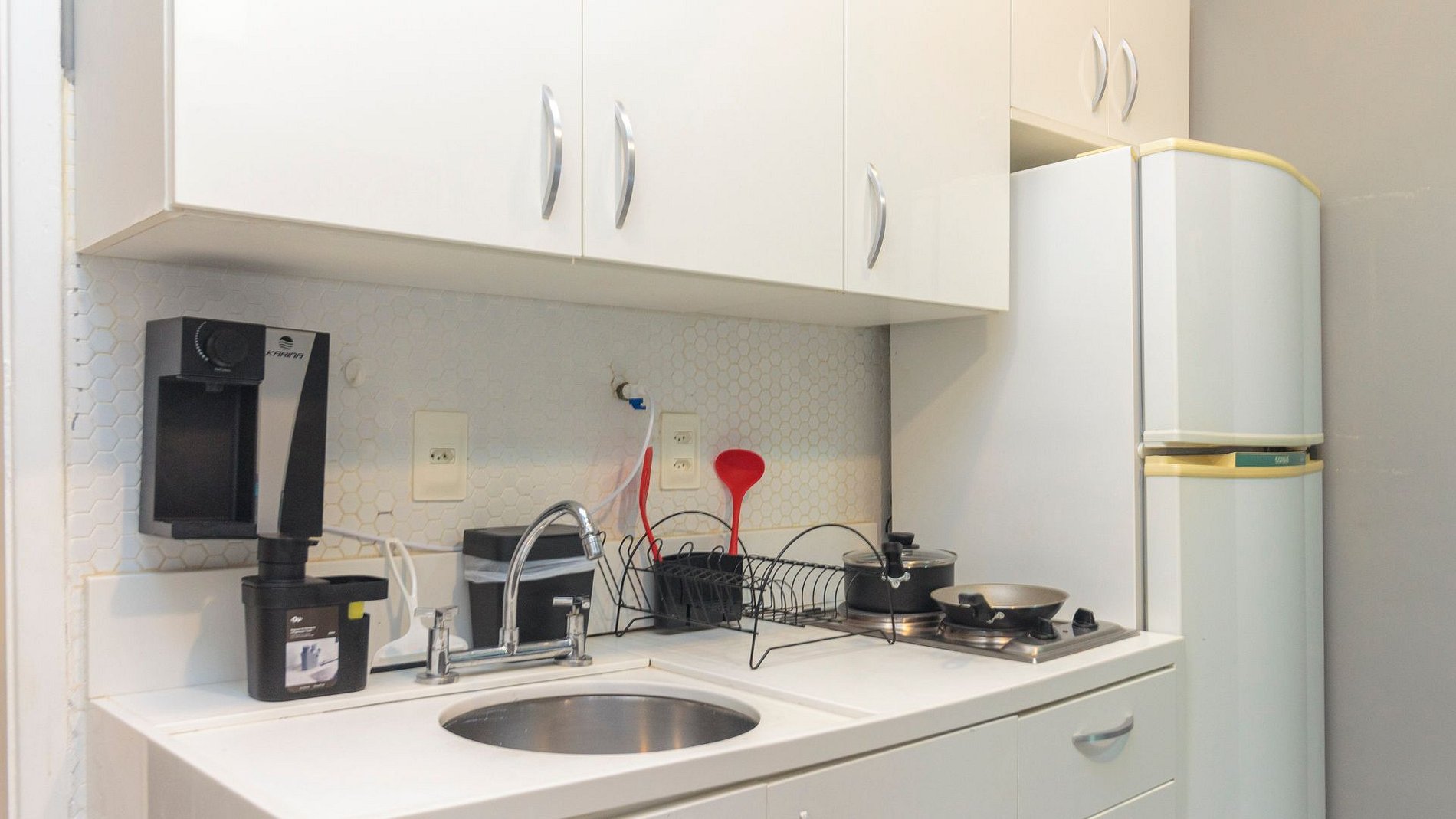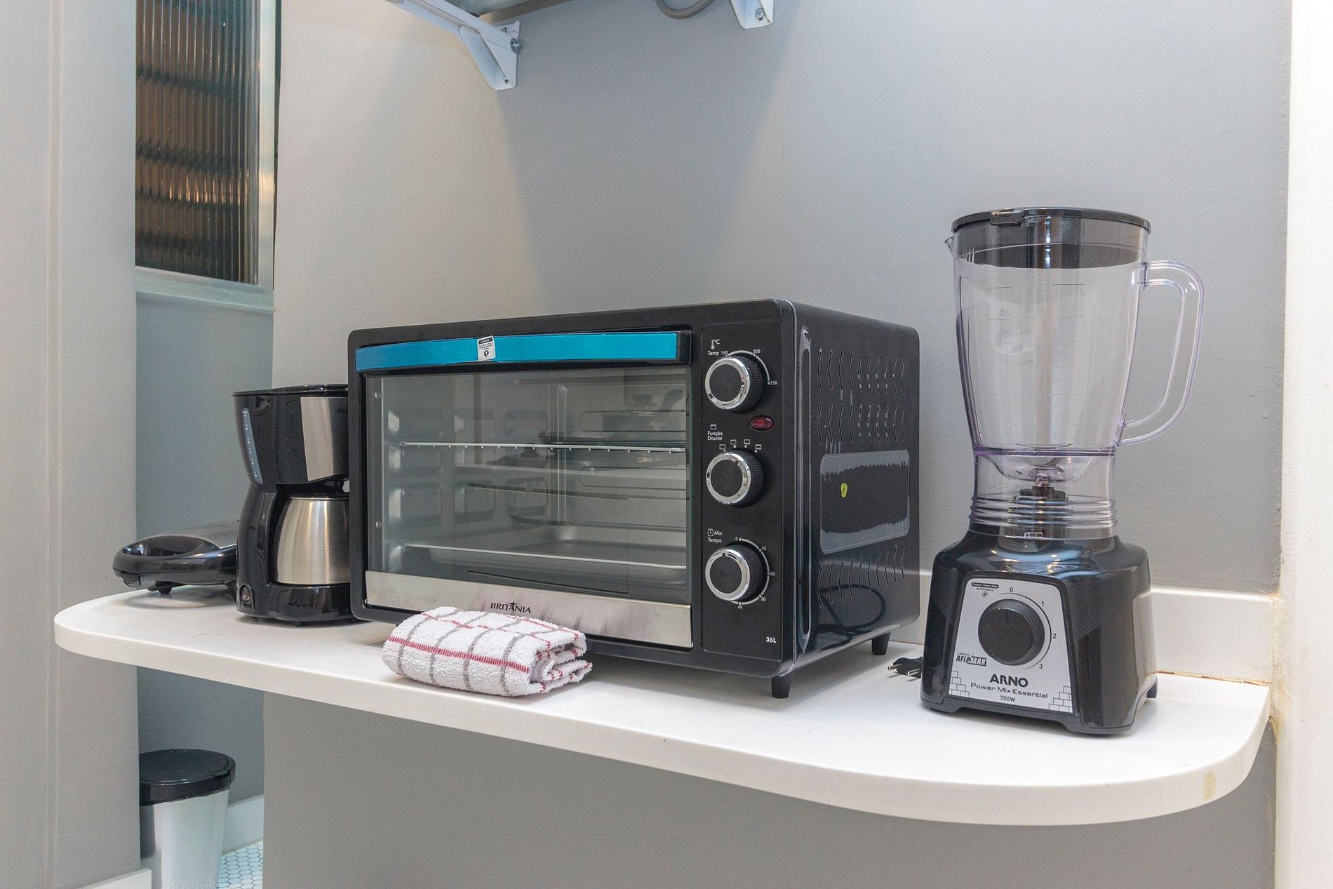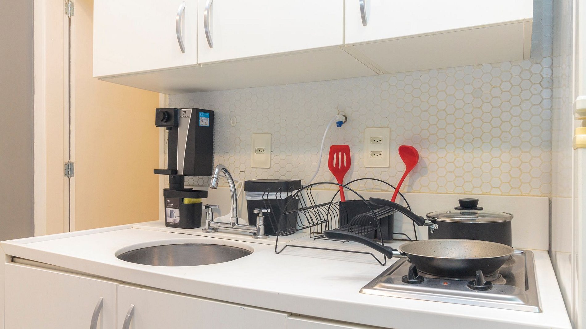 A cozinha é equipada com itens essenciais para o dia a dia, incluindo geladeira, cooktop, micro-ondas, forno elétrico, cafeteira, sanduicheira, liquidificador, filtro de água e utensílios básicos (pratos, copos, talheres)