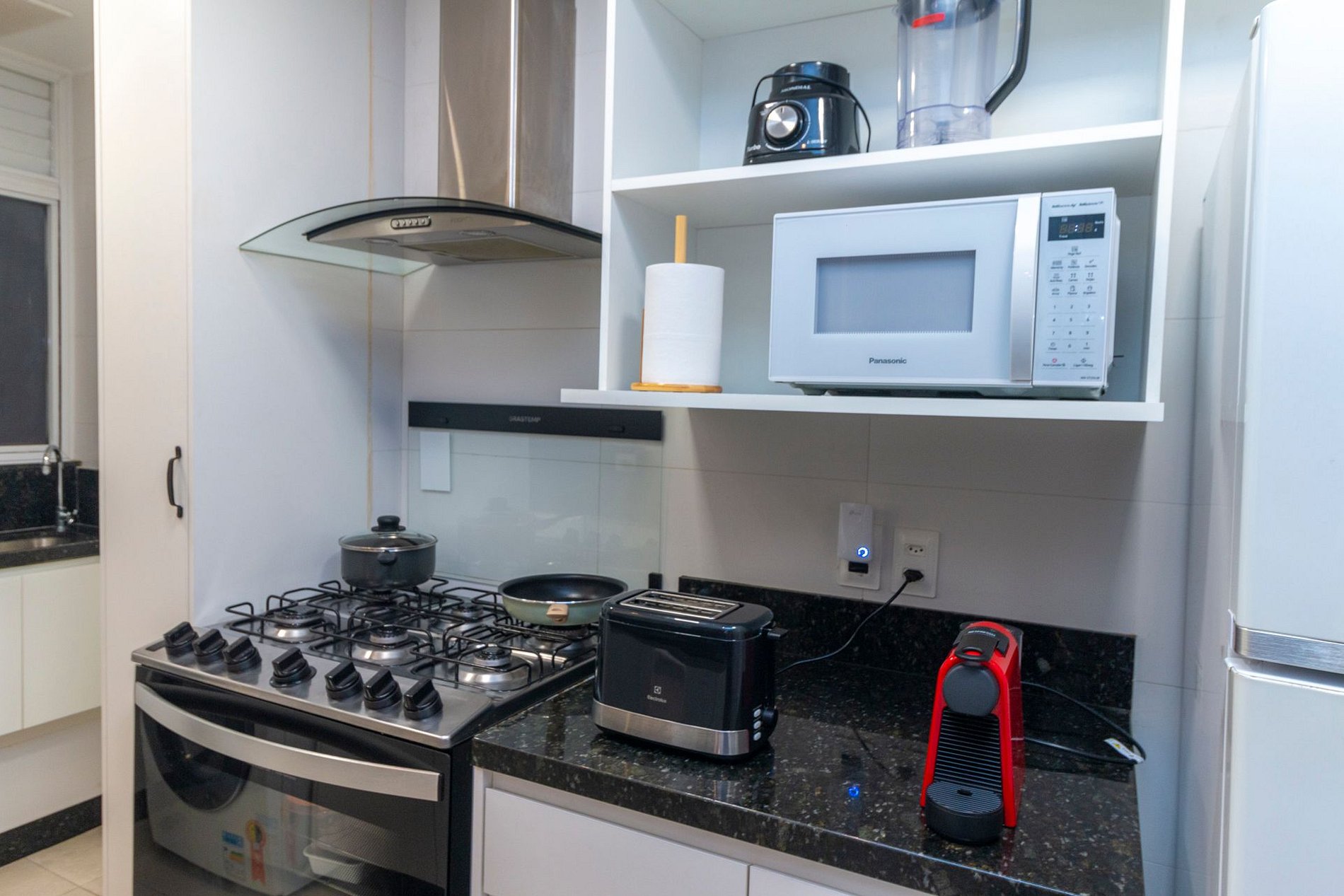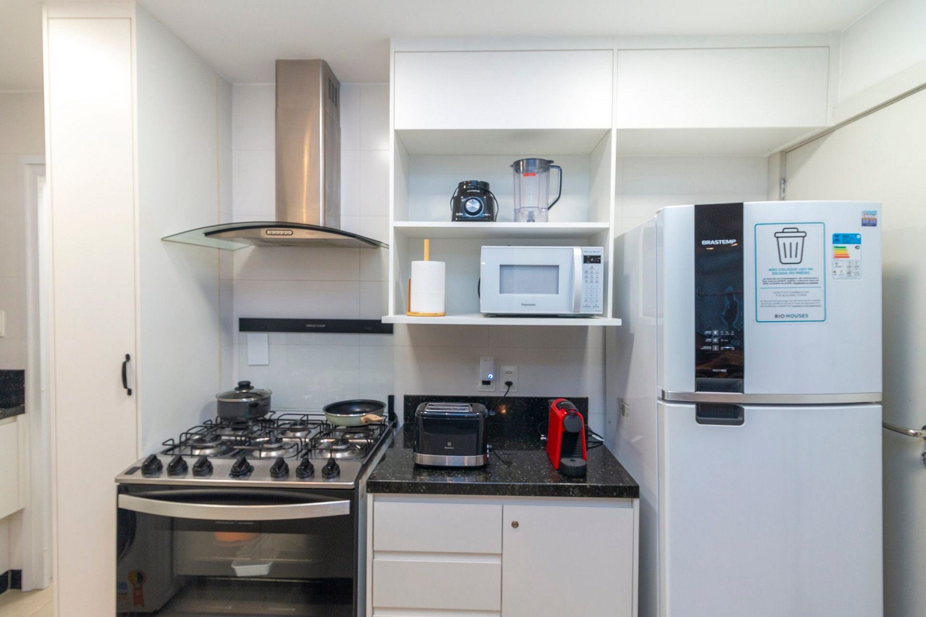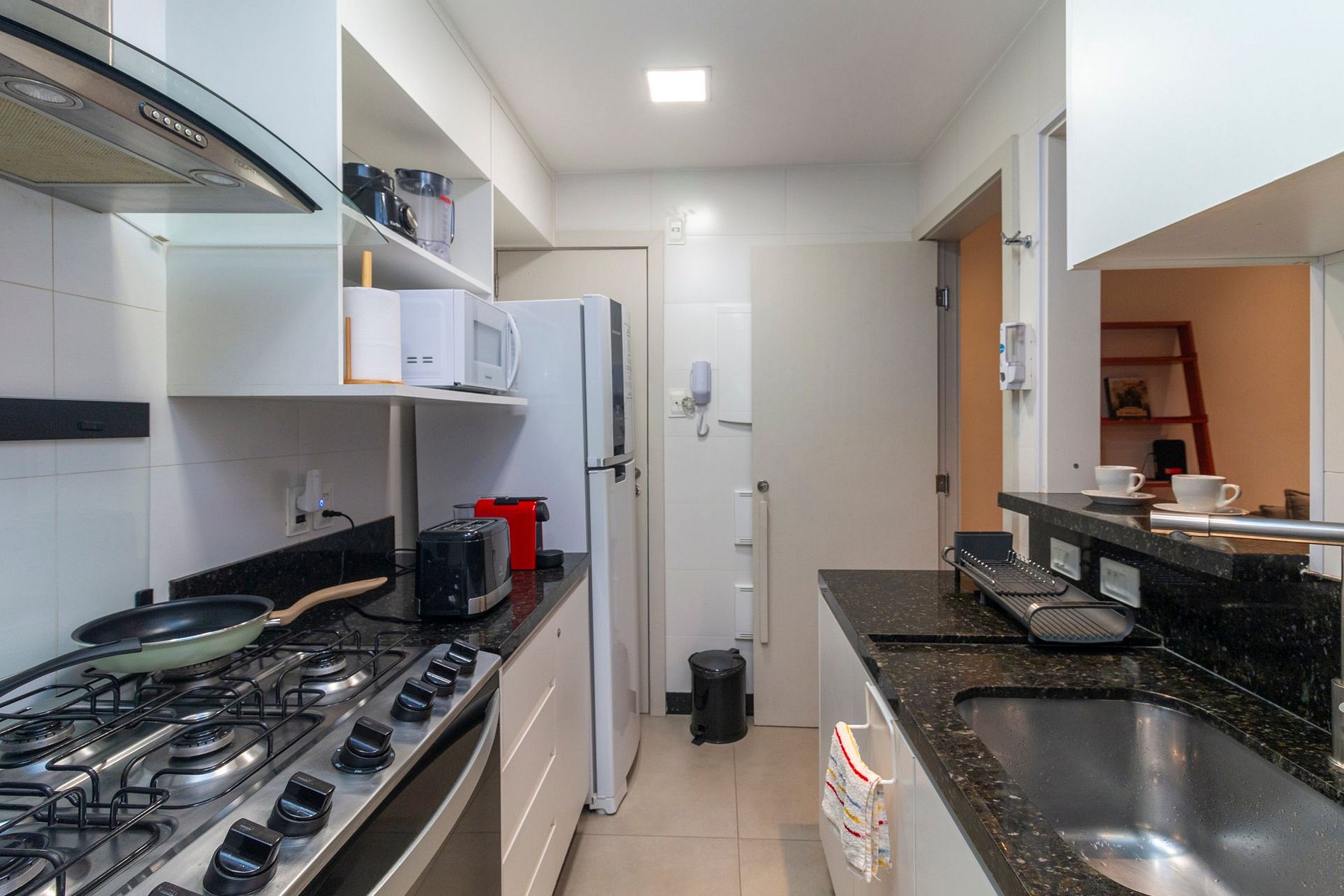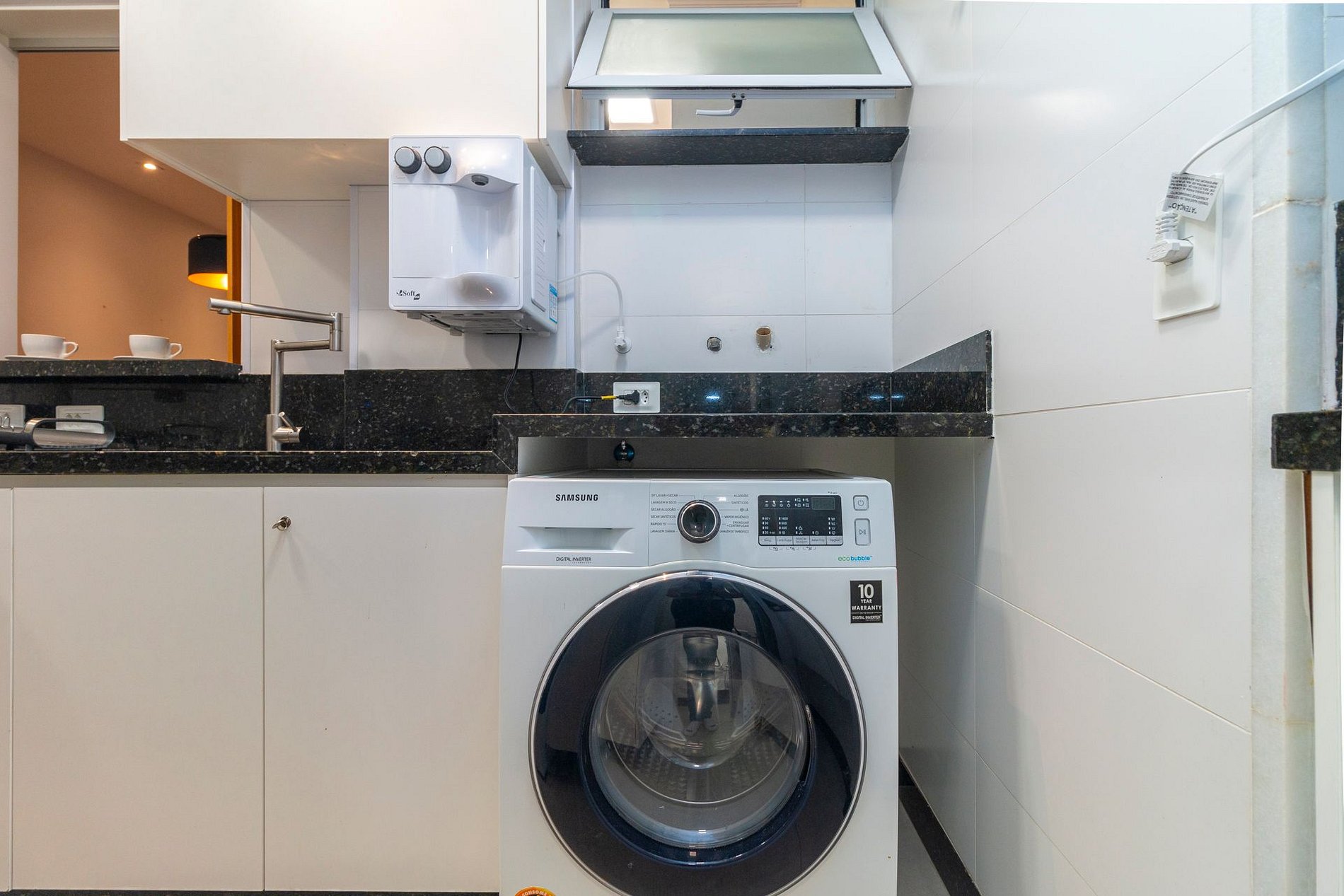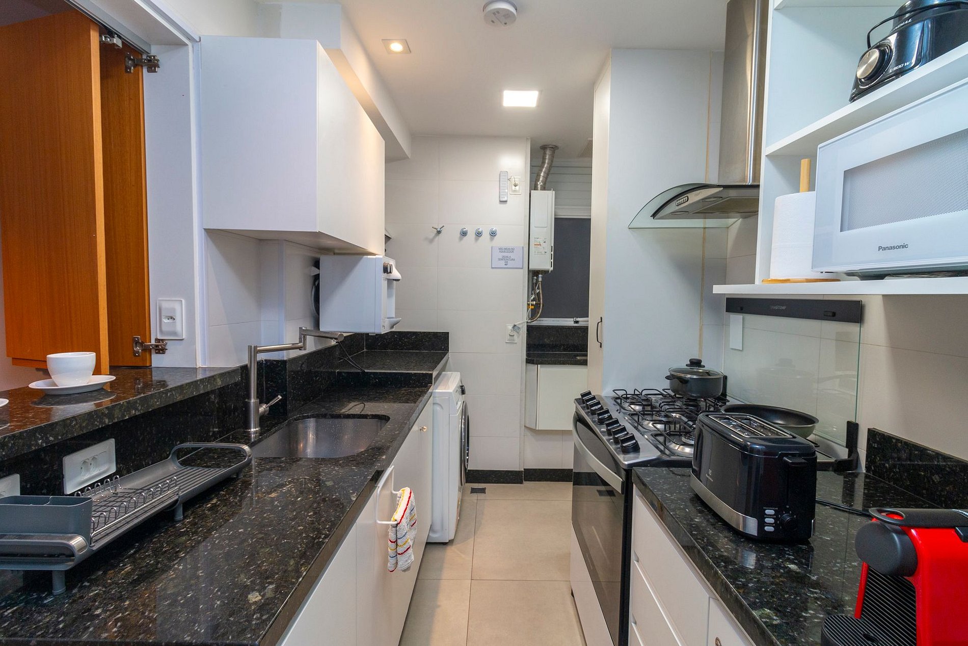 A cozinha é totalmente equipada com todos os eletrodomésticos e utensílios necessários para o dia a dia, incluindo cafeteira Nespresso, filtro de água, torradeira, fogão de 6 bocas com forno, geladeira e demais itens essenciais. Na área de serviço, os hóspedes encontram máquina lava e seca, tábua e ferro de passar, além de um banheiro completo de apoio com ducha utilizável.