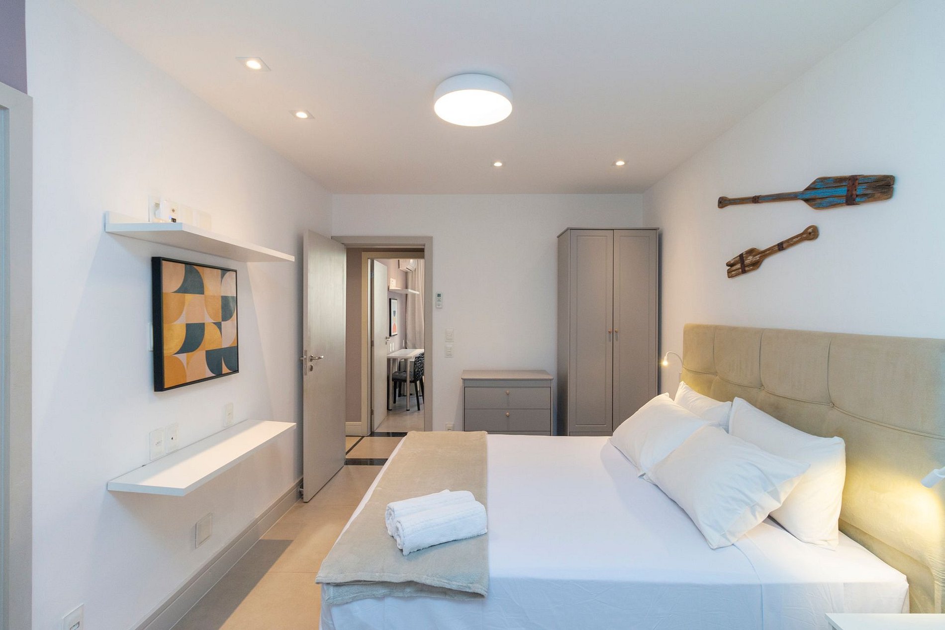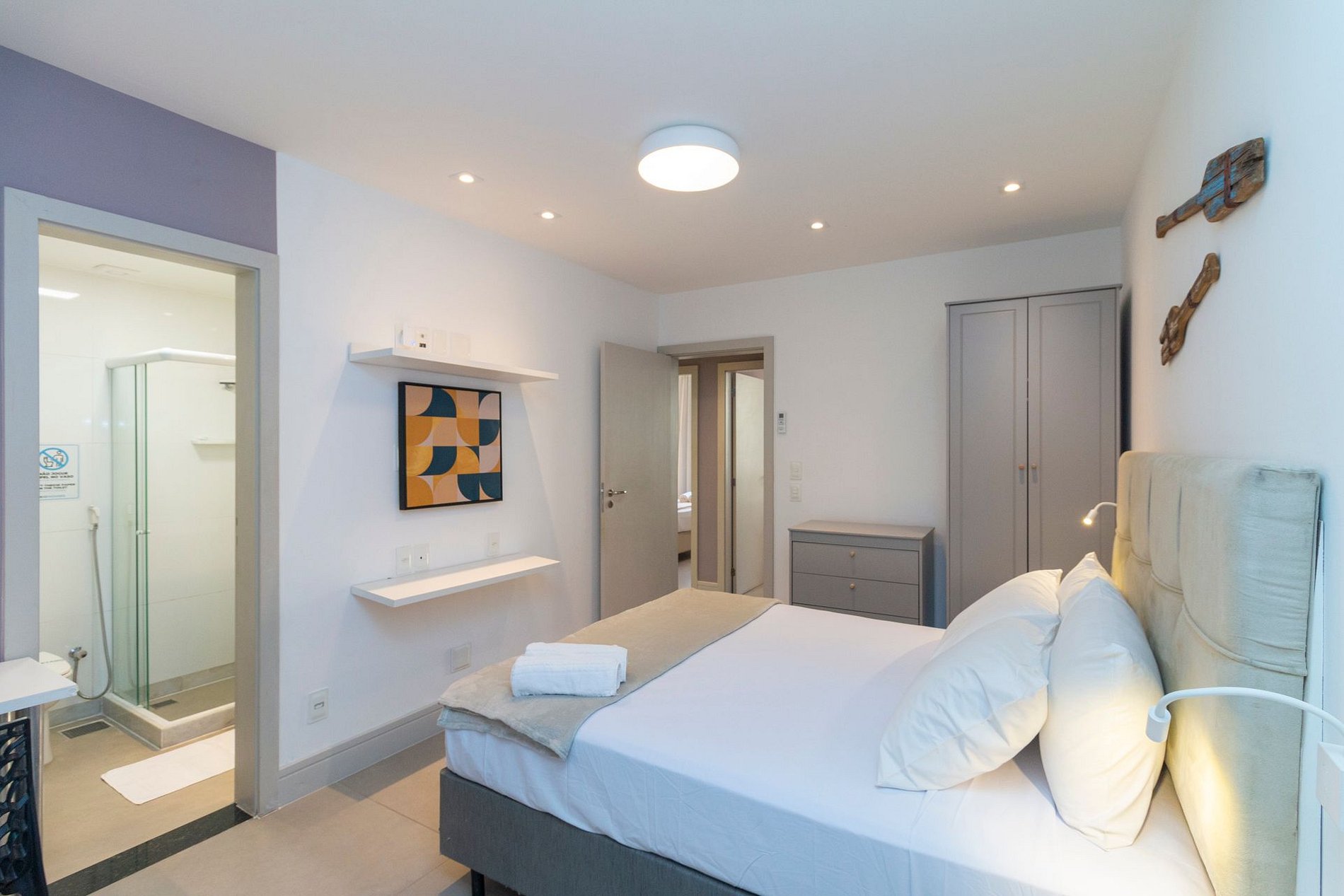 O imóvel dispõe de 1 suíte ampla com cama queen, ar-condicionado, armários, cortina blackout e banheiros completos com ducha aquecida. Há ainda mais 2 quartos, 1 com cama queen e outro com cama de casal, ar-condicionado, armário e cortina blackout, garantindo conforto para todos.