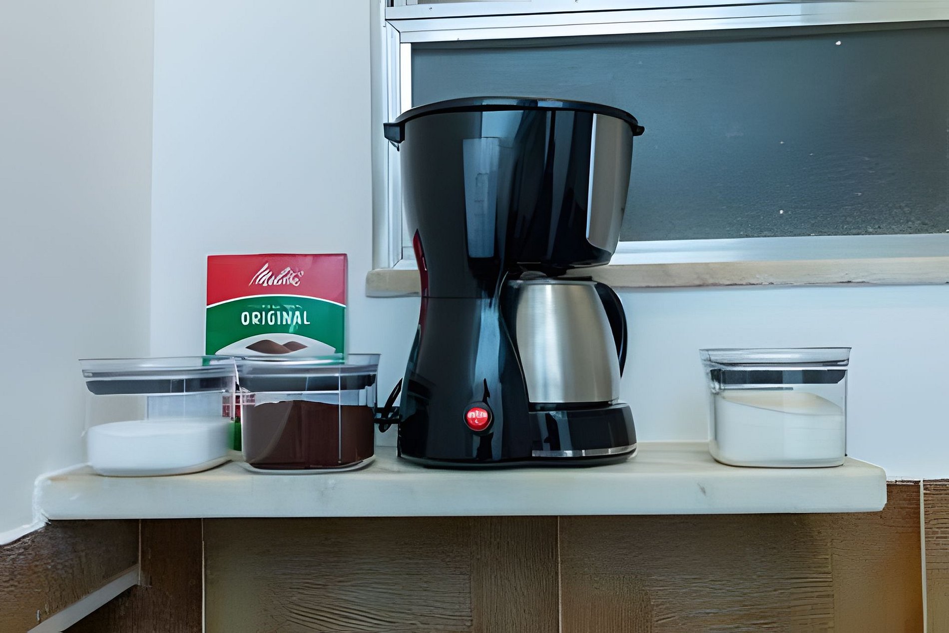 1 rolo de papel higiênico por banheiro, um recipiente com sal, um com açúcar e um com pó de café.