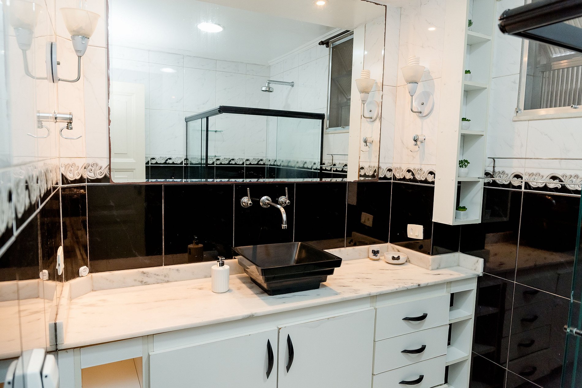 O apartamento conta com 2 banheiros sociais completo, um com chuveiro à gás e um com chuveiro elétrico. Além disso, há também 1 lavabo adicional na área social que complementa a estrutura, garantindo mais comodidade para grupos maiores.
