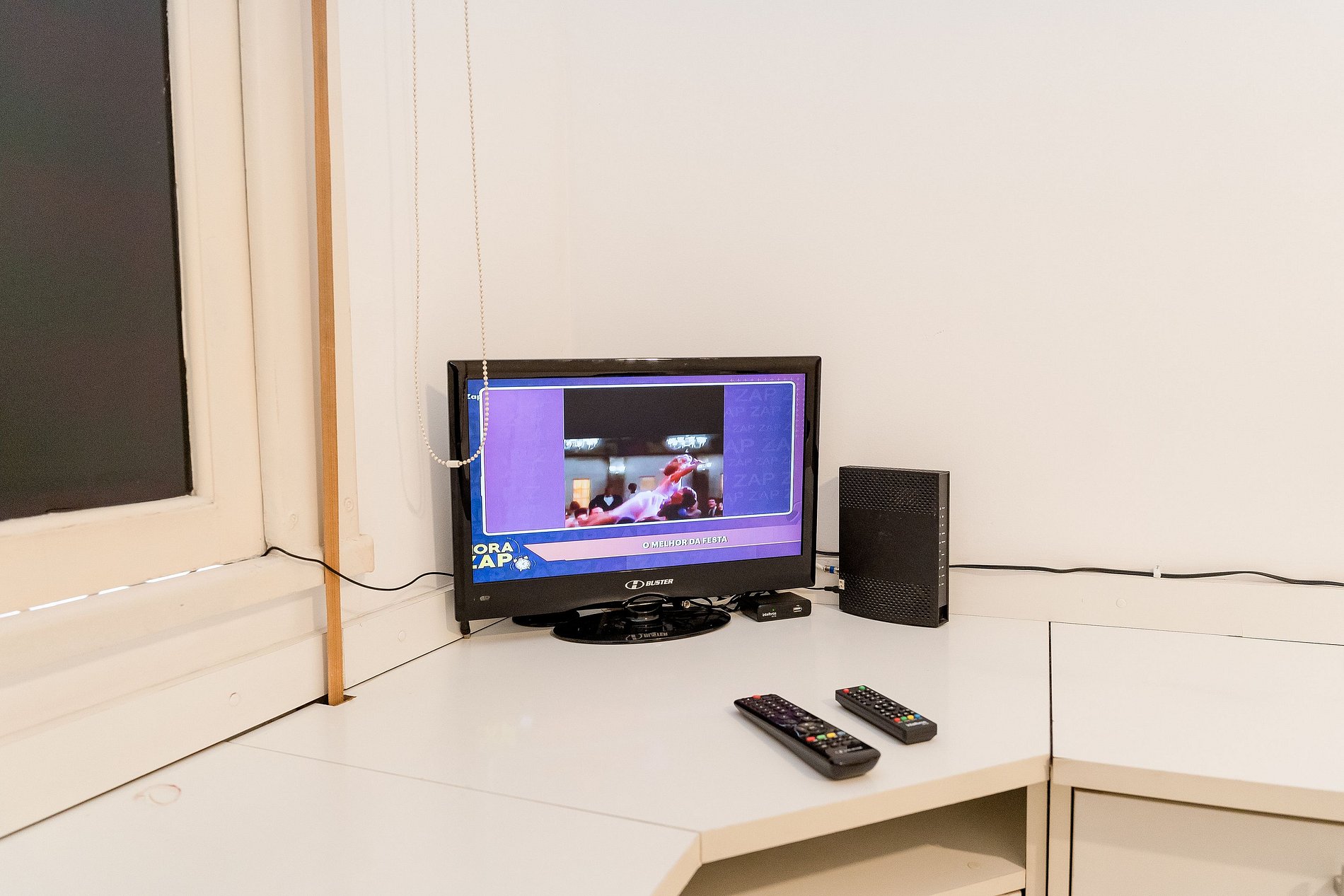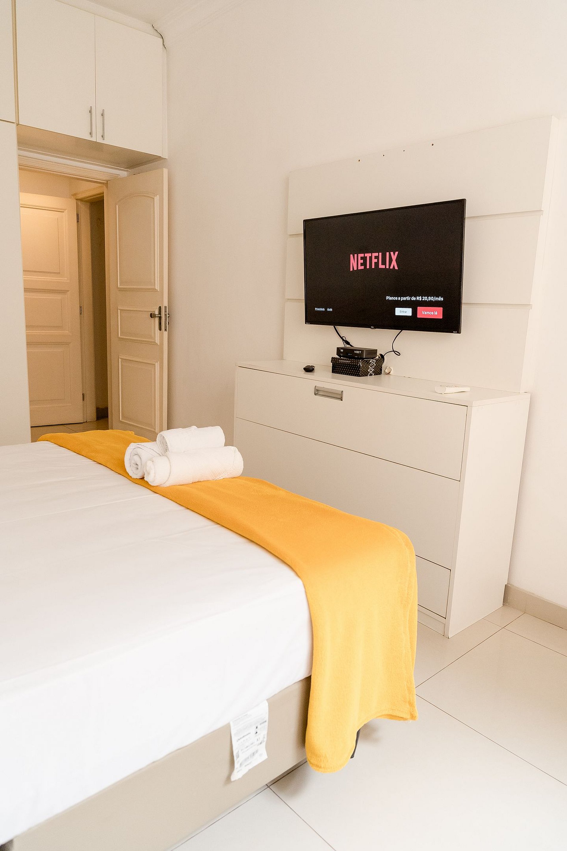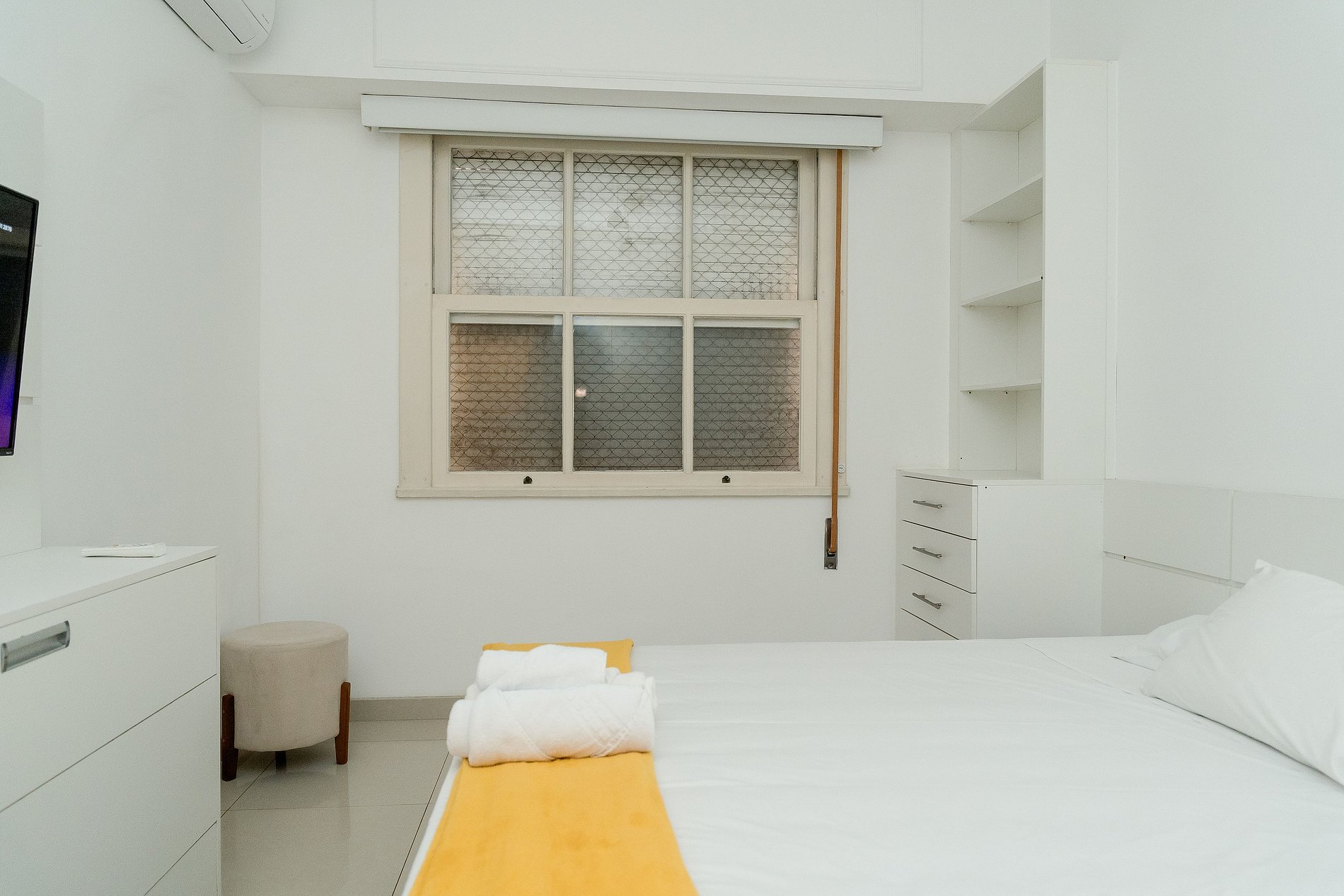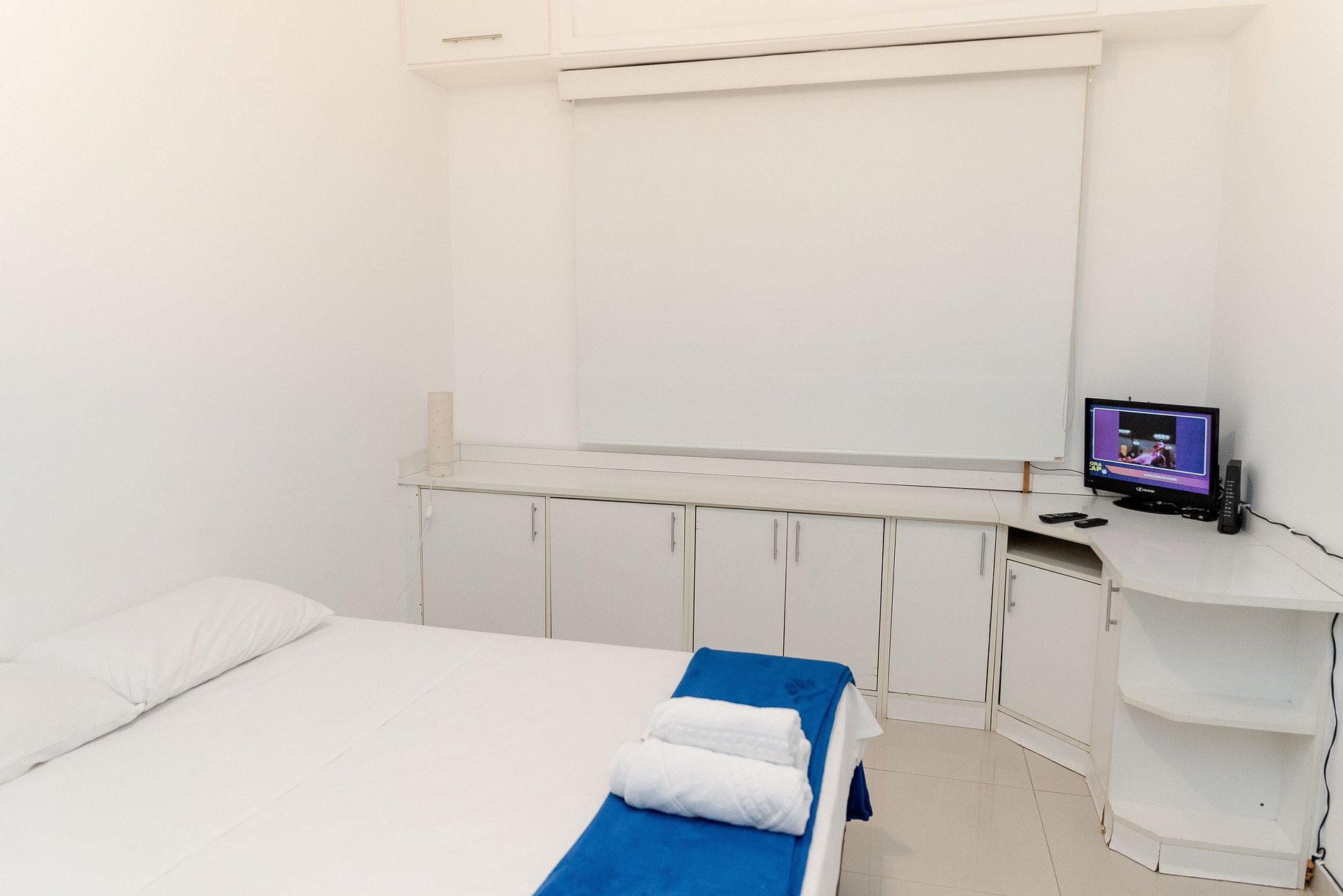 O segundo quarto é amplo e conta com cama de casal, armário, cortinas blackout e televisão.