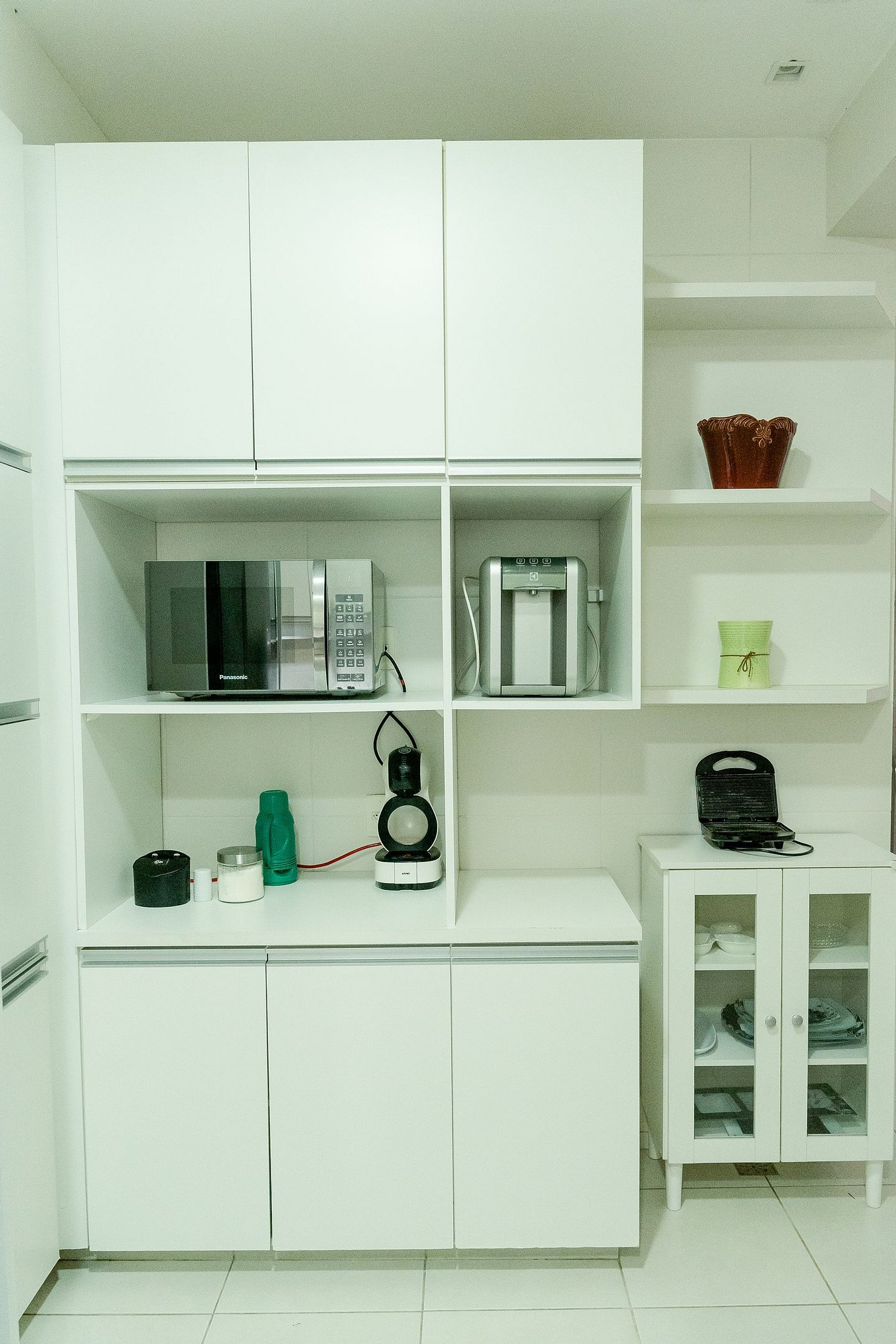 A cozinha é completamente equipada para que você se sinta em casa. Com geladeira duplex, forno e fogão a gás, micro-ondas, liquidificador, cafeteira e utensílios completos, preparar suas refeições será uma experiência prática e agradável. O espaço conta ainda com bancadas amplas e filtro de água, proporcionando funcionalidade em cada detalhe.