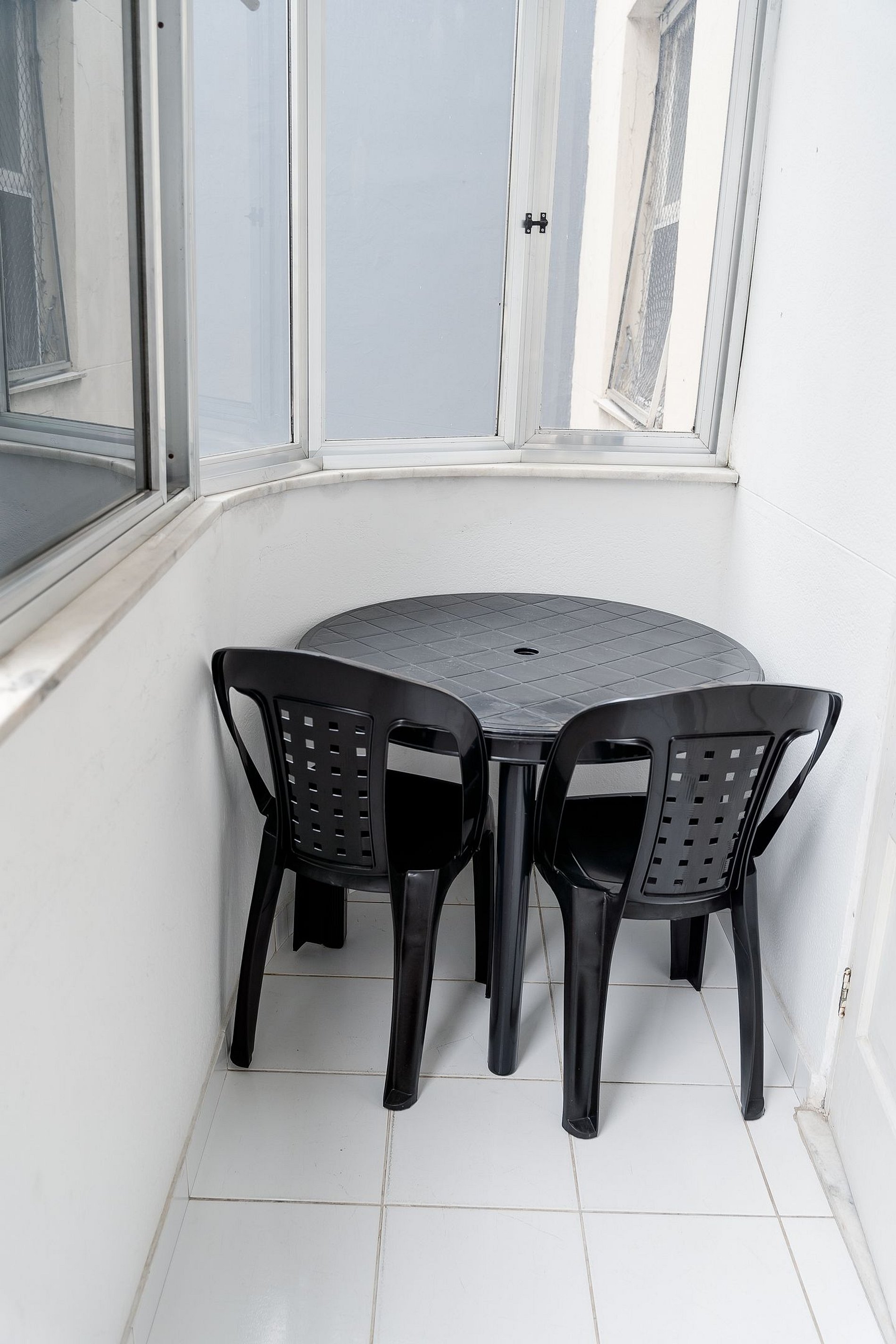 A varanda é um cantinho especial do apartamento, perfeita para momentos de descanso. Com uma mesa e cadeiras, você pode desfrutar de uma vista agradável da cidade enquanto relaxa ou toma um café.