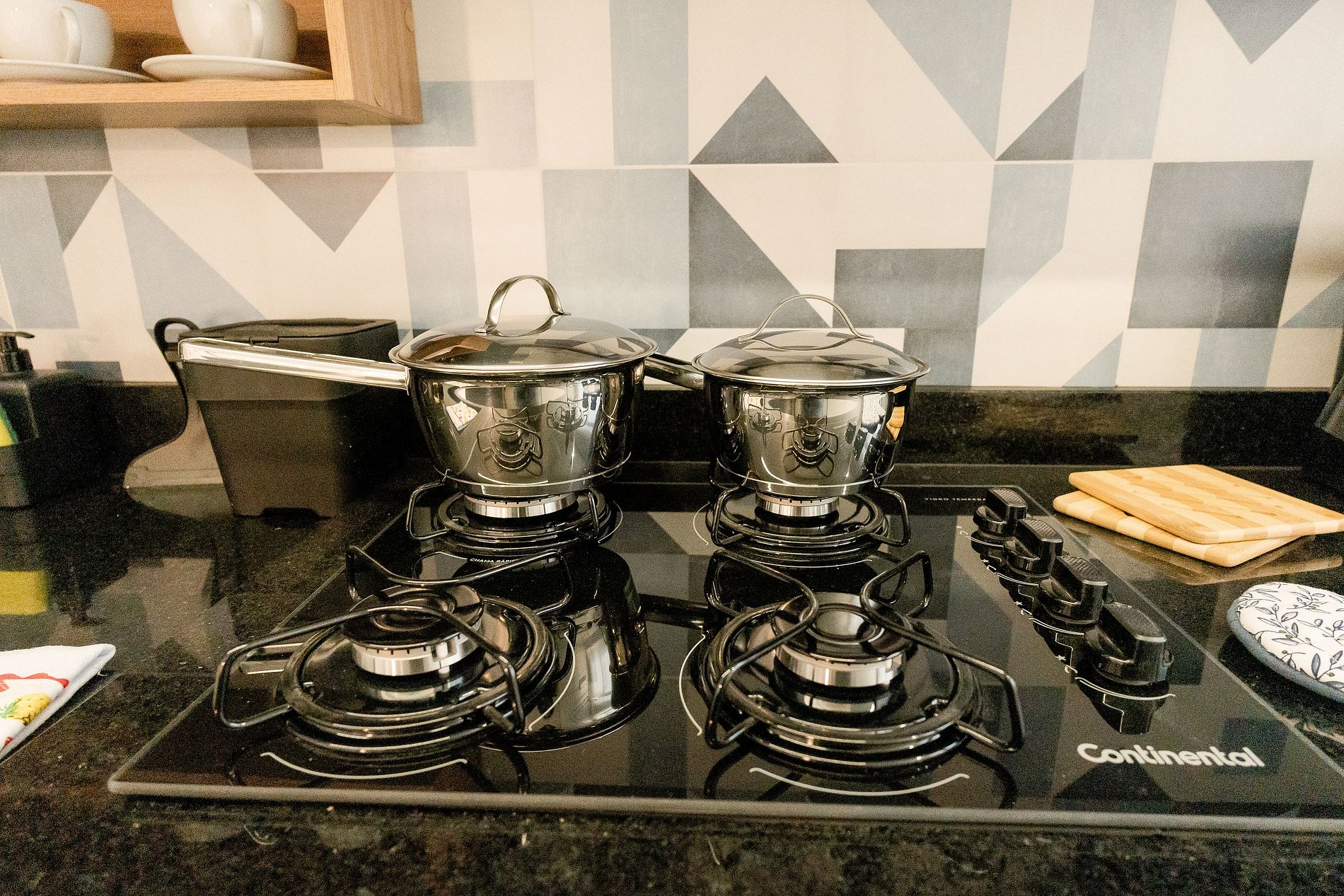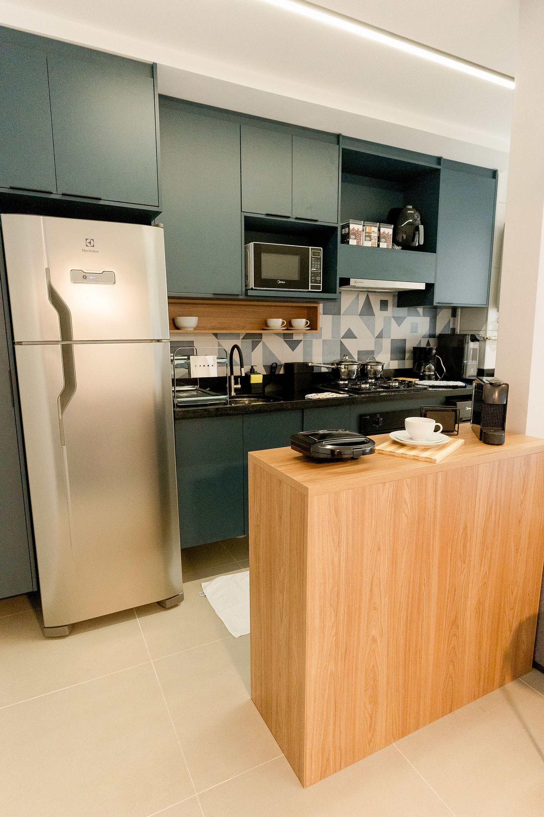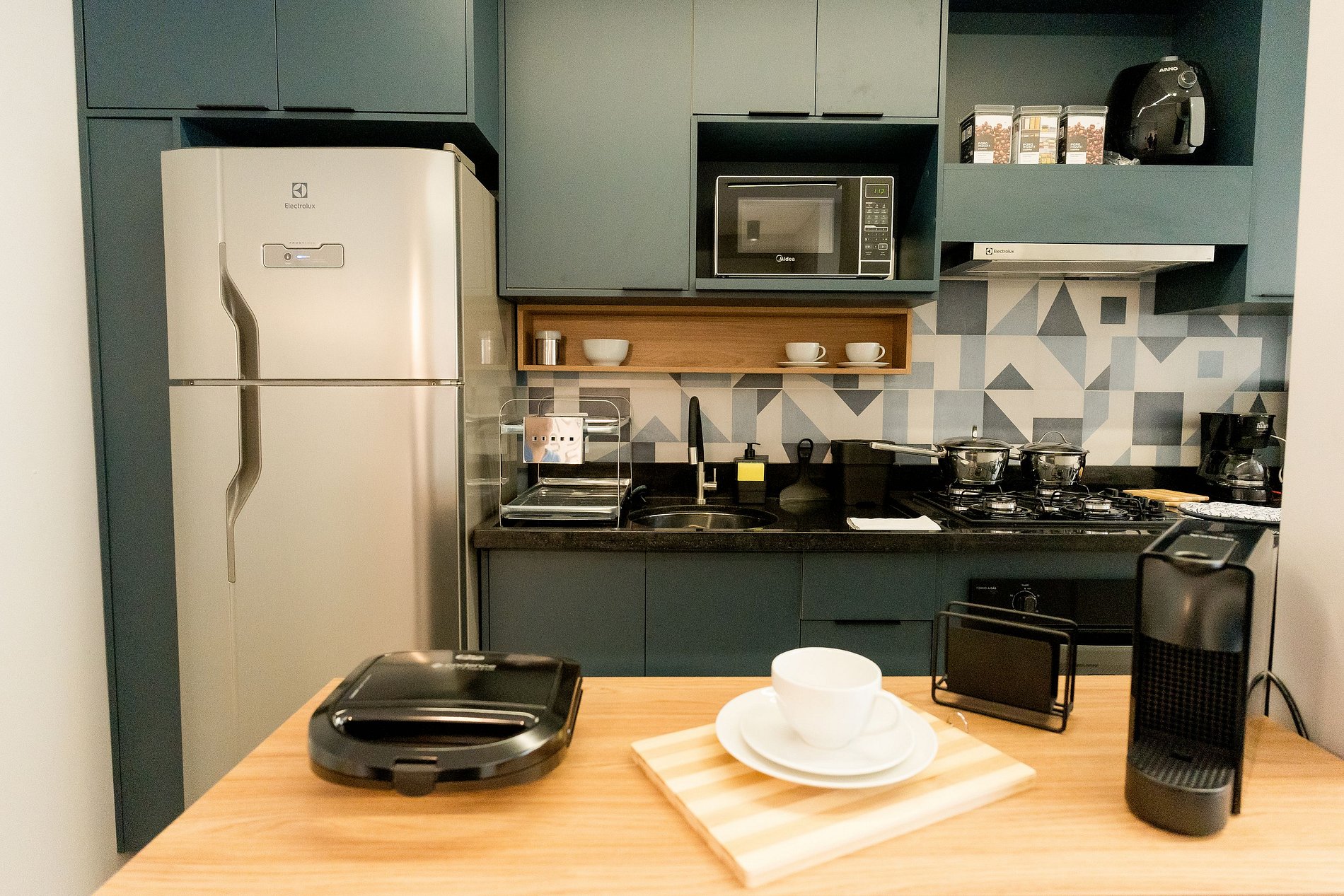 A cozinha é completa, equipada com eletrodomésticos como geladeira, cooktop, forno, micro-ondas, cafeteira, sanduicheira e liquidificador, além de utensílios essenciais para preparar refeições com praticidade.