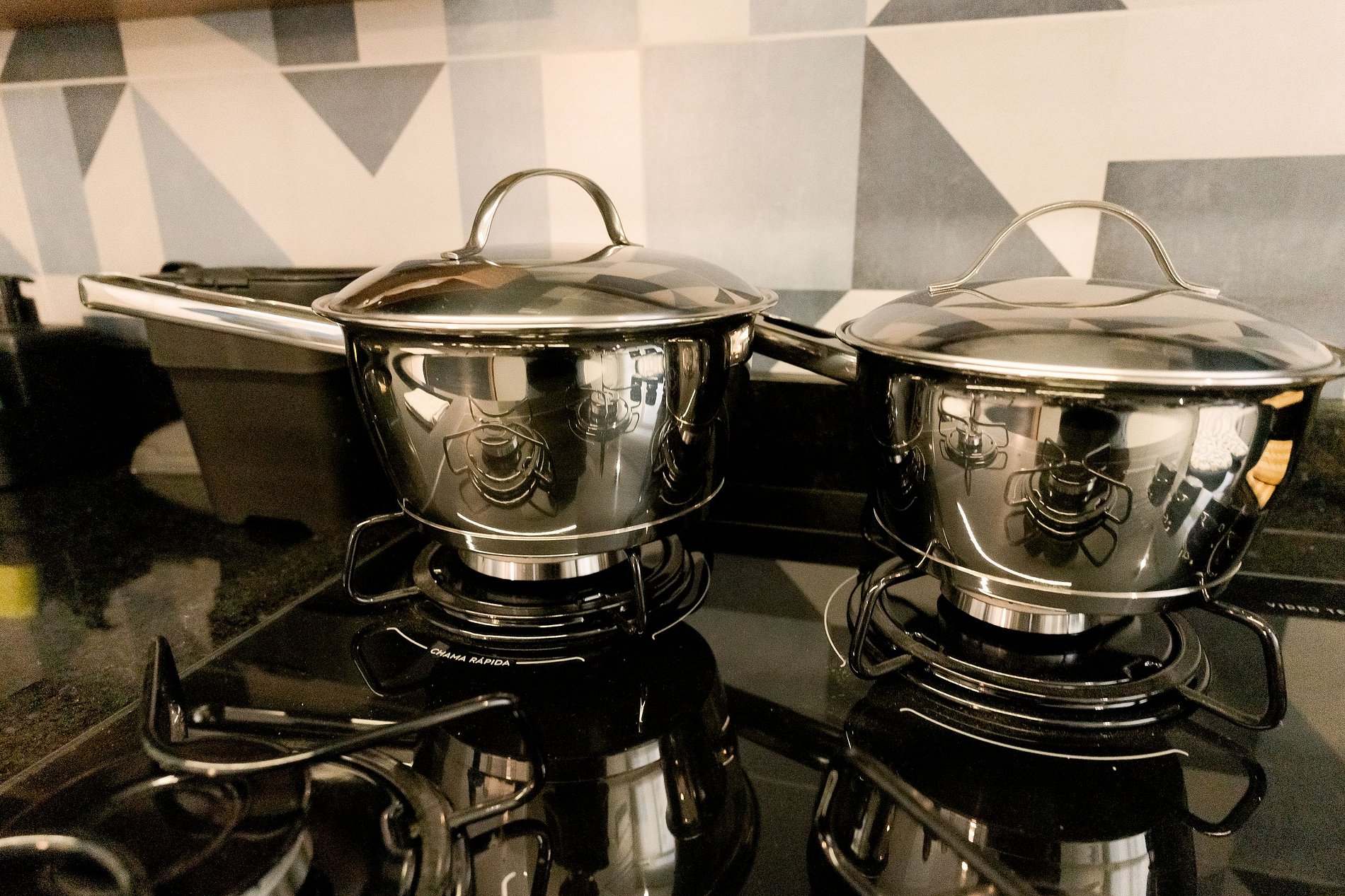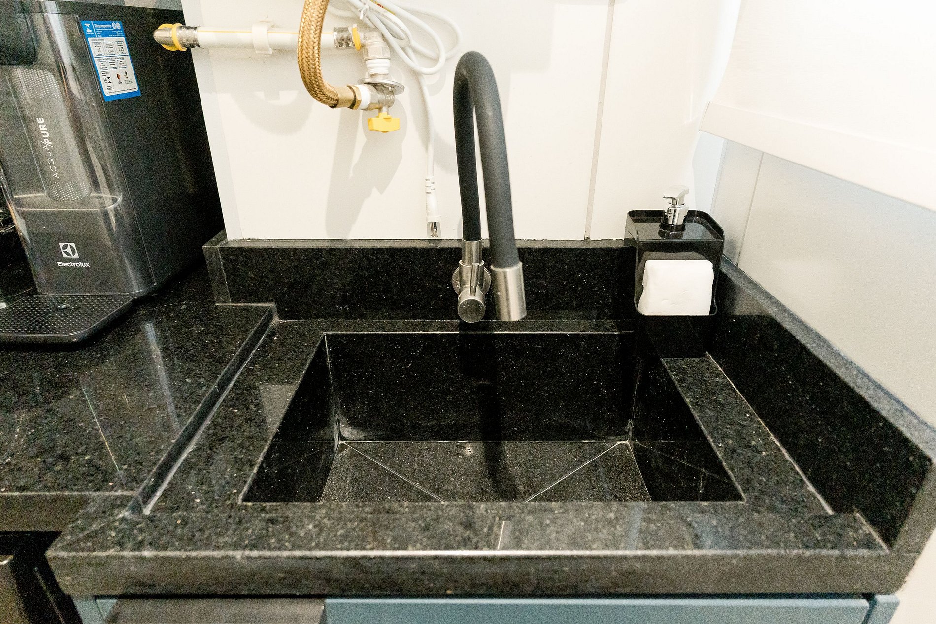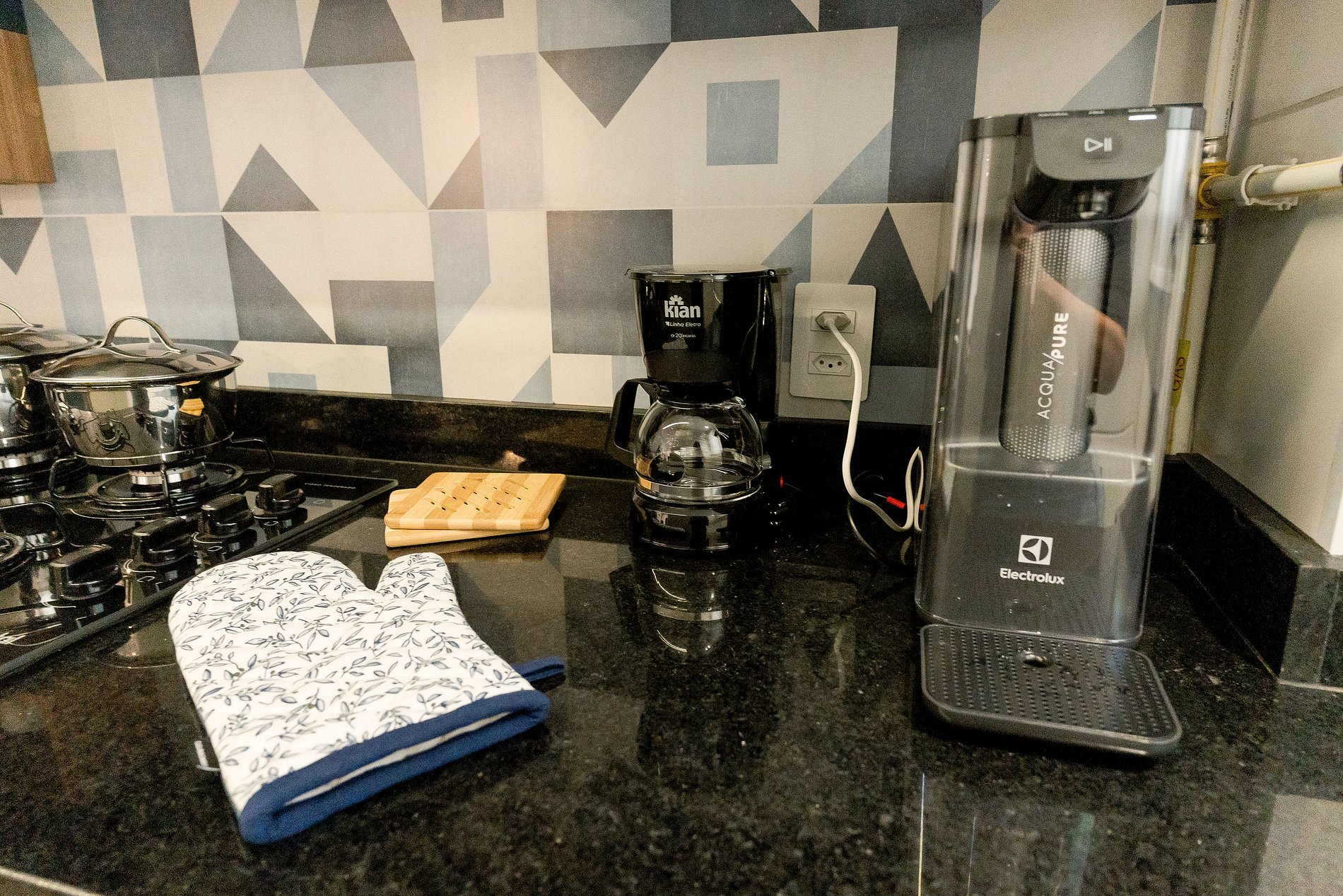 A cozinha é completa, equipada com eletrodomésticos como geladeira, cooktop, forno, micro-ondas, cafeteira, sanduicheira e liquidificador, além de utensílios essenciais para preparar refeições com praticidade.