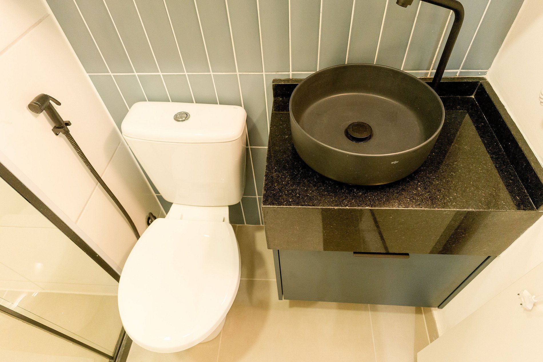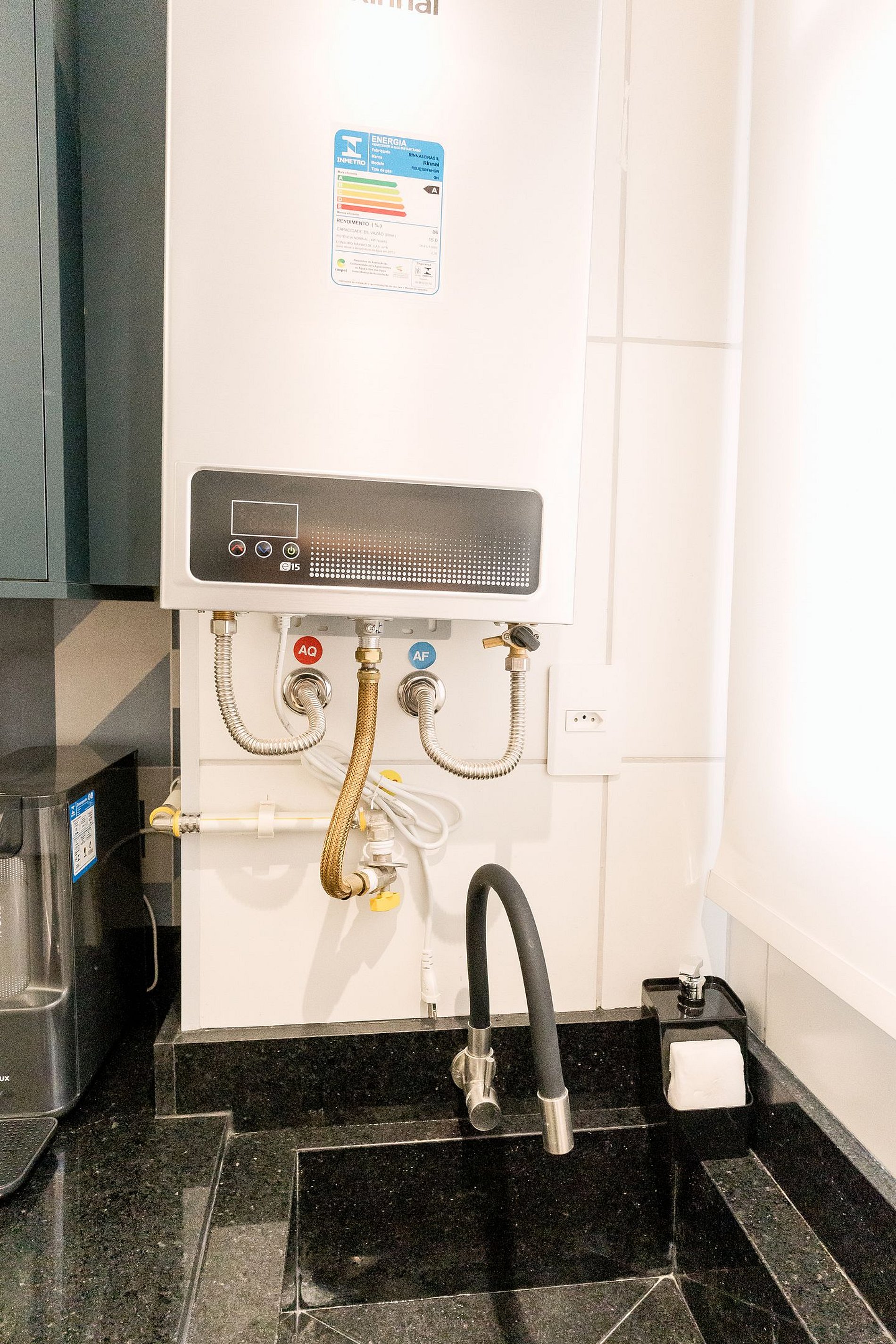 O banheiro é moderno e funcional, com chuveiro aquecido a gás e secador de cabelo disponível para uso.