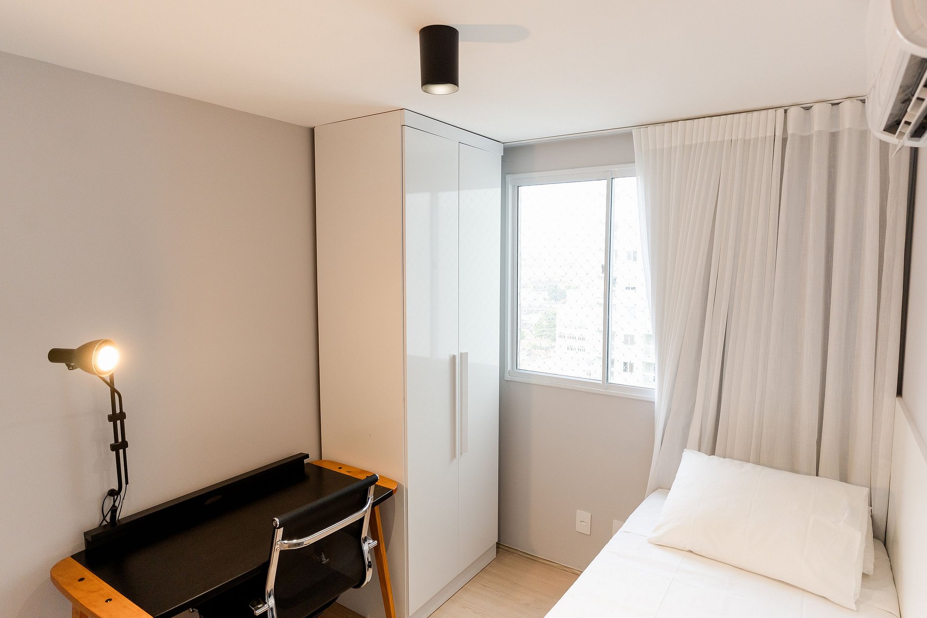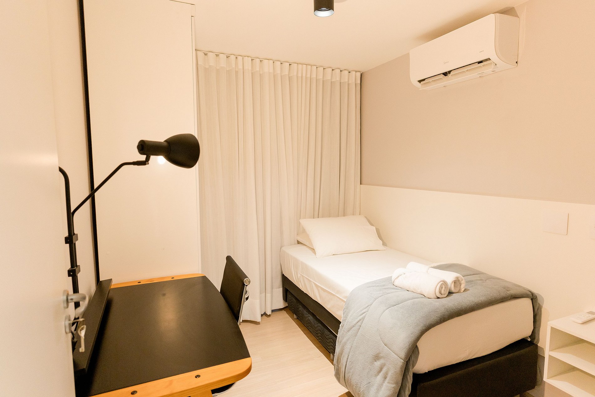 - Outro com 2 camas de solteiro, mesa de trabalho, ar-condicionado, blackout e armário.