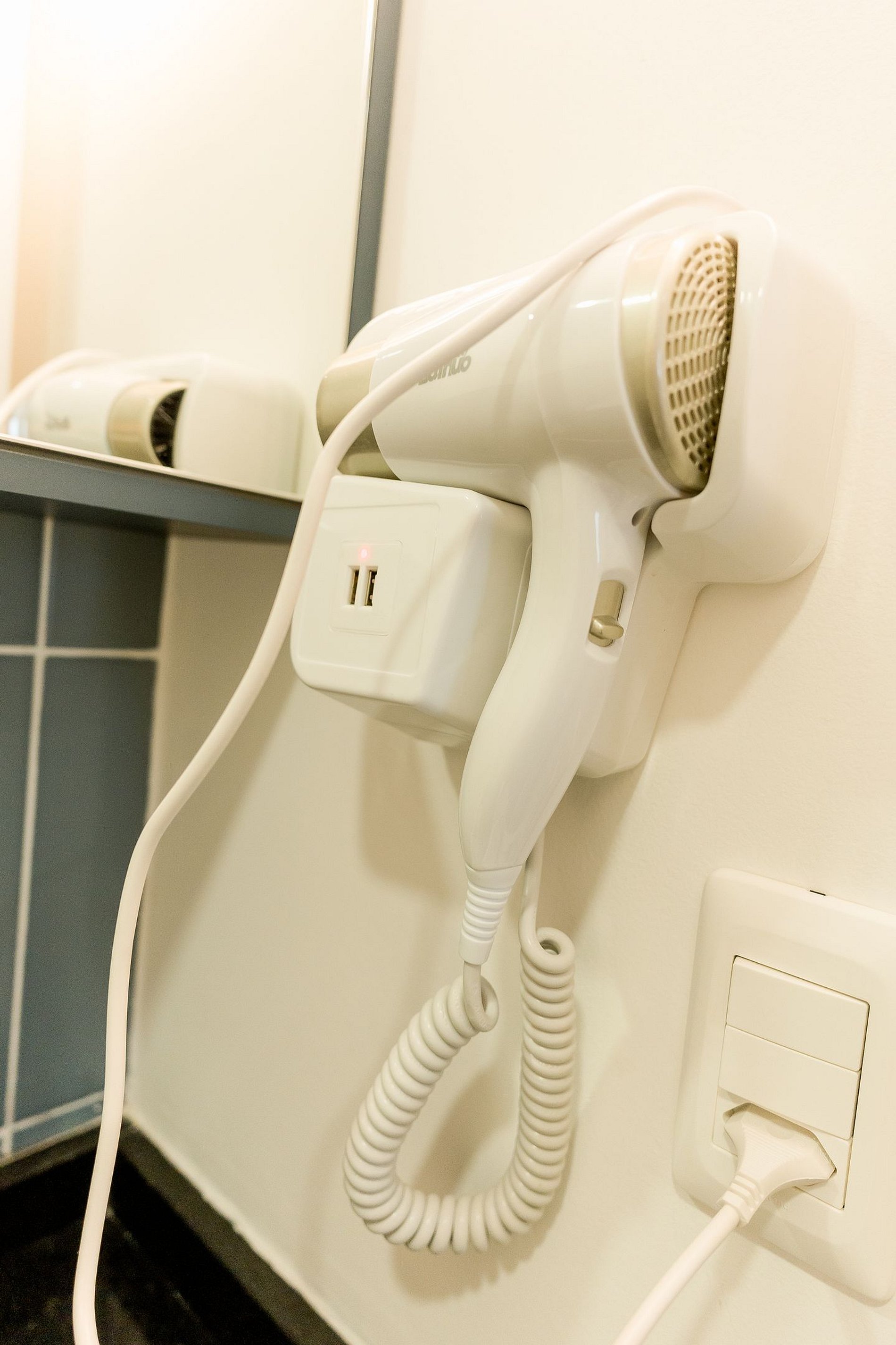 Ferro de passar roupa e secador de cabelo disponíveis.