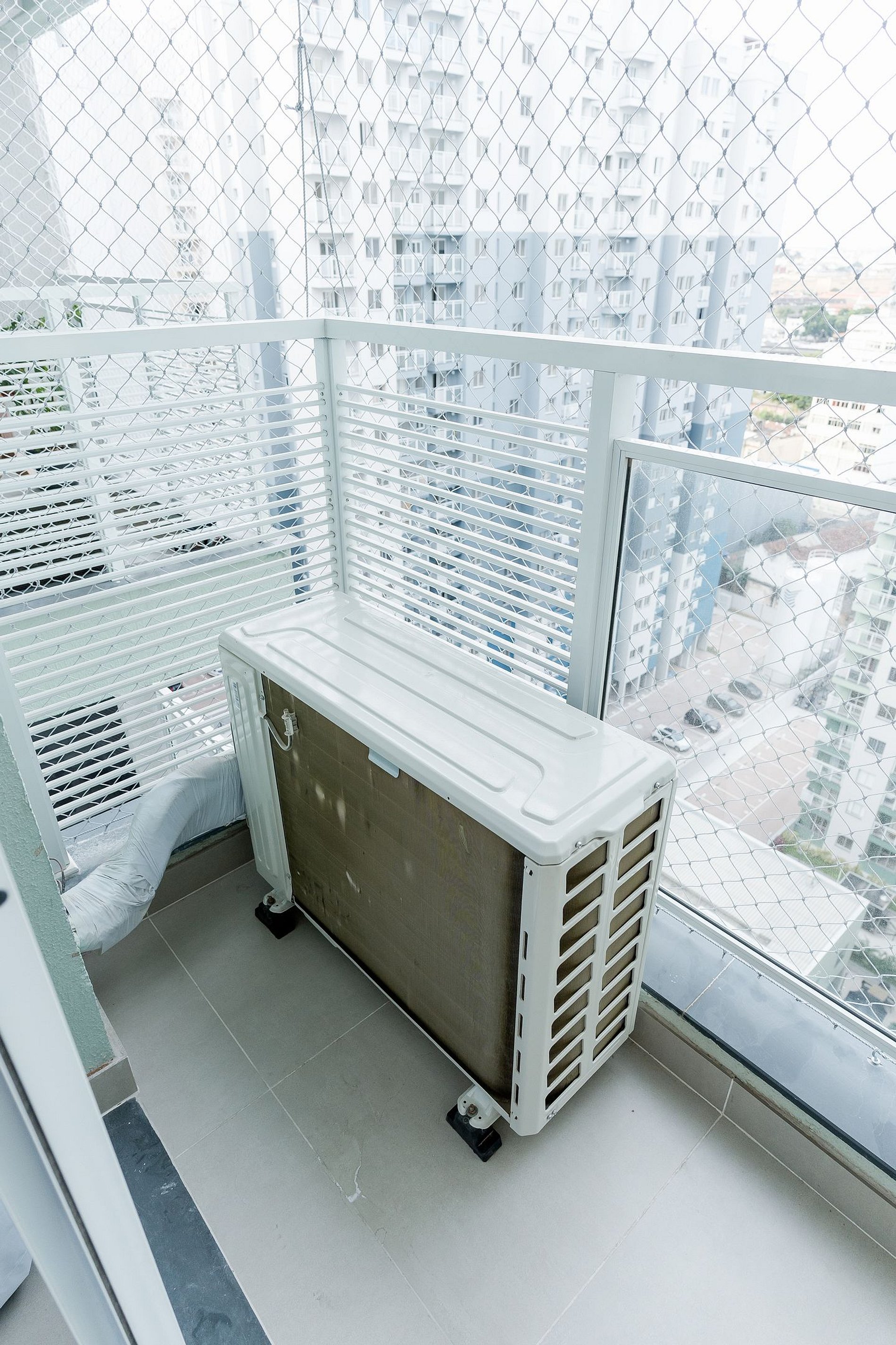 Na sala, os ambientes de estar e jantar são integrados, com mesa para quatro pessoas, sofá, Smart TV, ar-condicionado e uma agradável varanda.