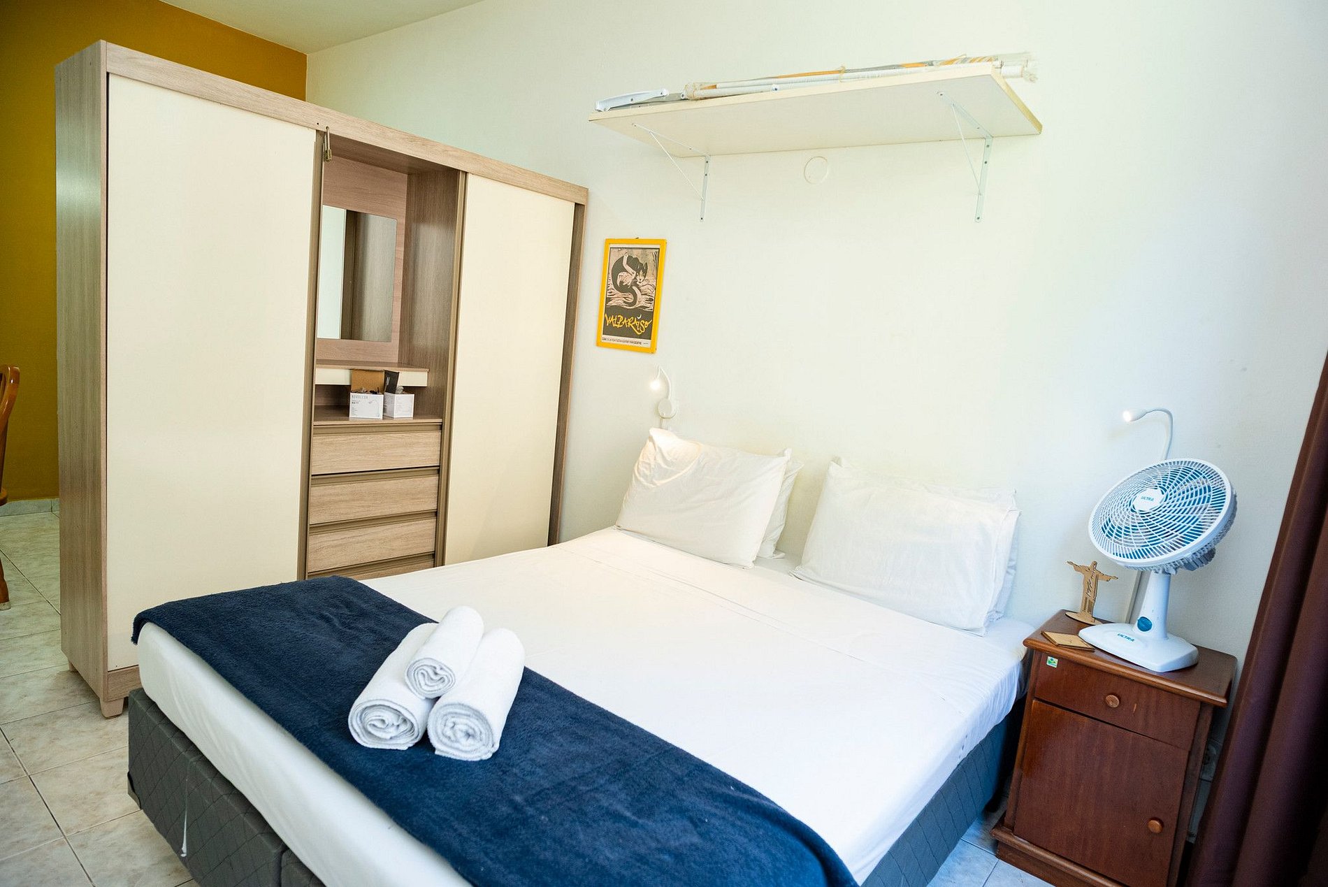 A sala possui sofá-cama de solteiro e mesa com 3 cadeiras, ideal para trabalhar, comer ou relaxar. O quarto tem cama de casal, ar-condicionado portátil, ventilador de mesa e TV com acesso a plataformas de streaming.