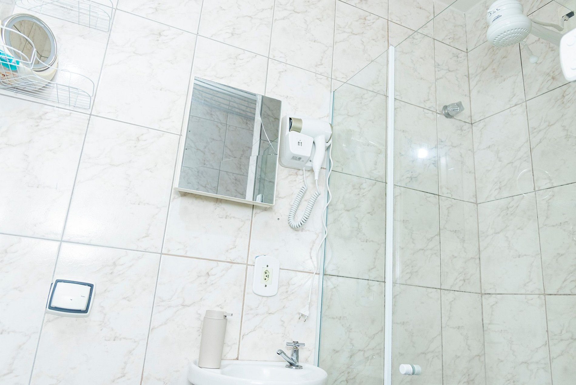 O banheiro é completo, com chuveiro elétrico, máquina de lavar roupas, secador de cabelo e ferro de passar disponível para os hóspedes.
