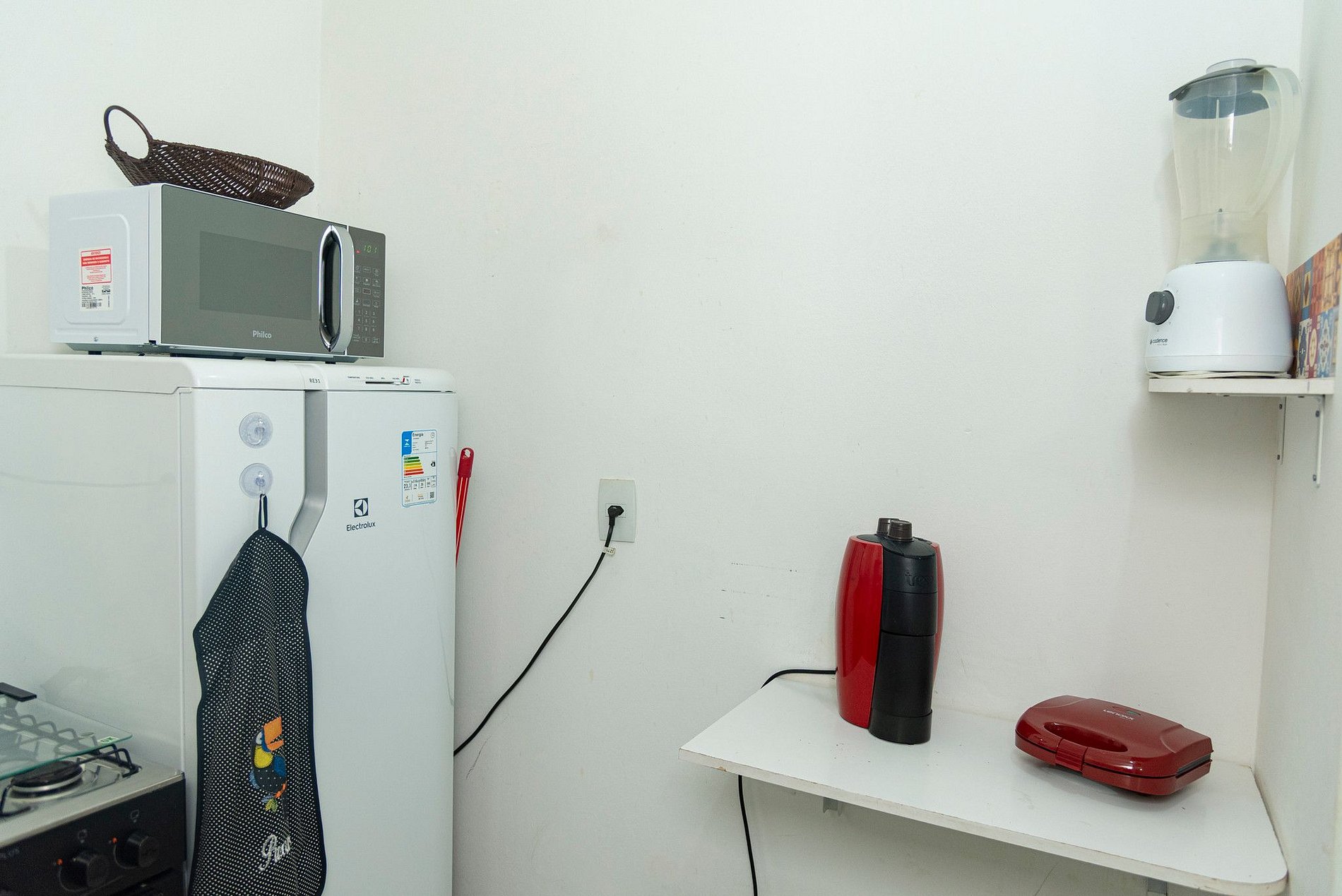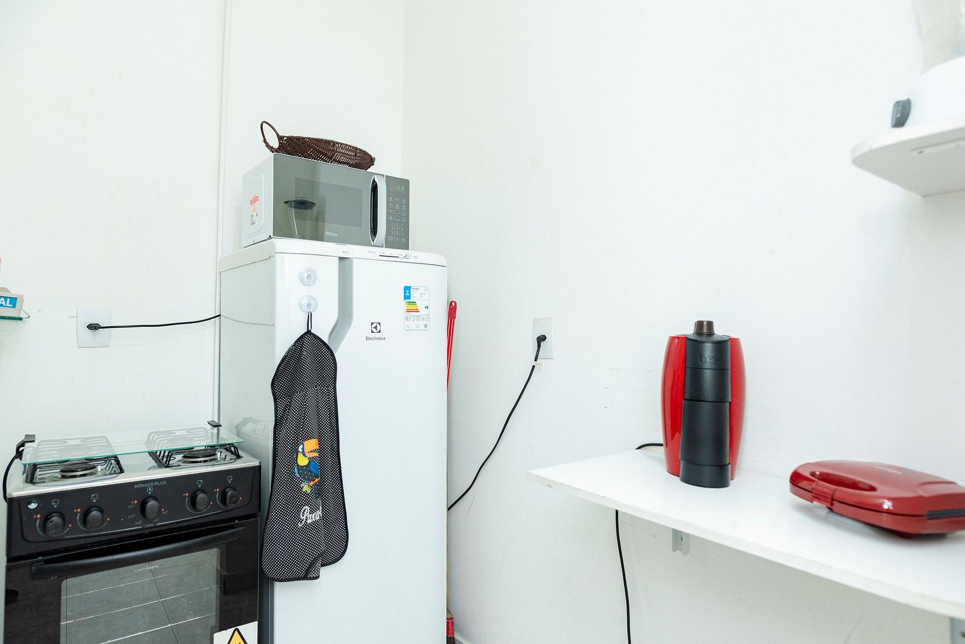 A cozinha é funcional e conta com geladeira, fogão, forno, micro-ondas, liquidificador, cafeteira Nespresso, sanduicheira e utensílios básicos para preparo de refeições.